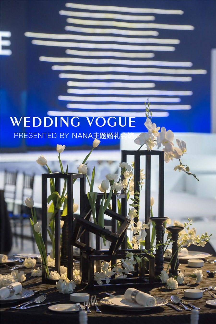 在本次婚礼秀的整场设计中,设计师为了能够让现场最终呈现出一个较为和谐的整体氛围,所有的布置材料都选用了较为硬朗的材质来做设计呈现,力求达到一种干净且统一的氛围感受。