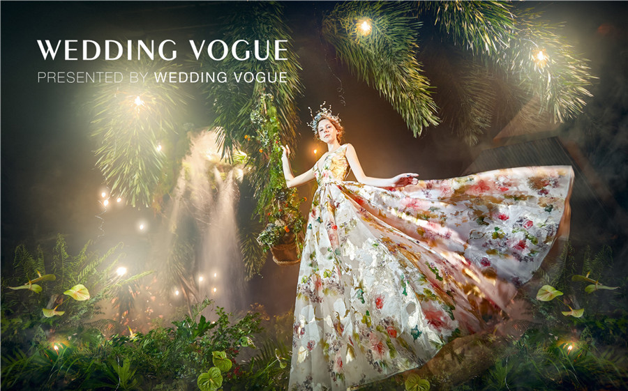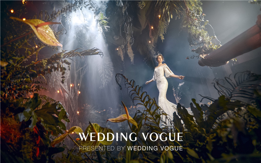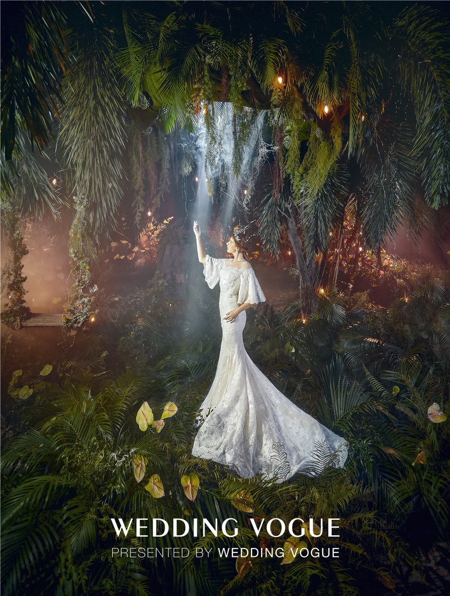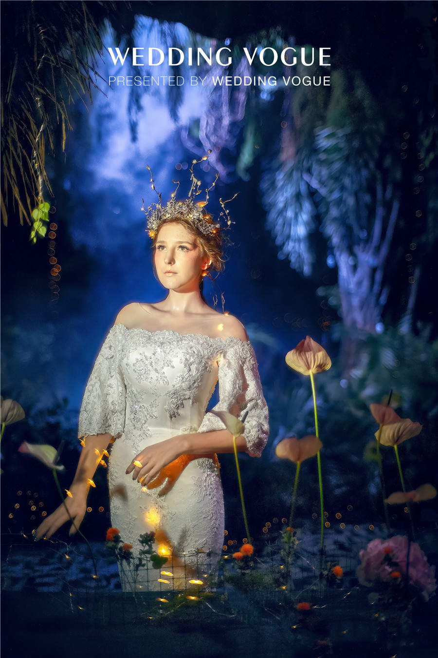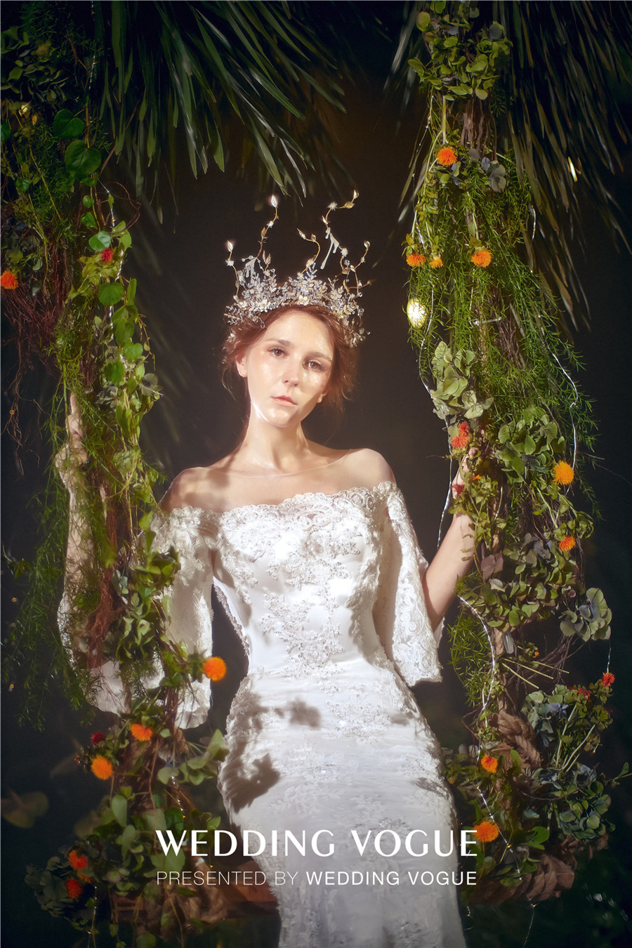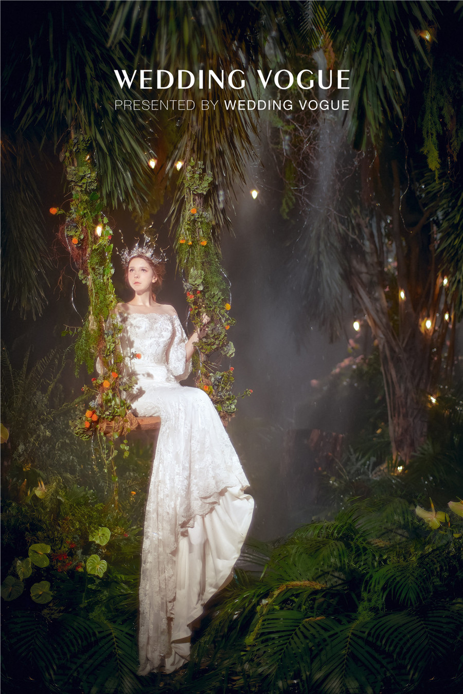 身着修身的鱼尾白纱模特,像鱼儿一样游弋,性感而自由。透明的一字肩纱拼接,随意宽大的袖子设计,自在舒展游走其中。亦或者坐在花草编织的秋千上,怡然自得,人物与景色自然而然的融合在了一起,让人不自觉摈住呼吸,生怕破坏这一幅美丽的画卷。