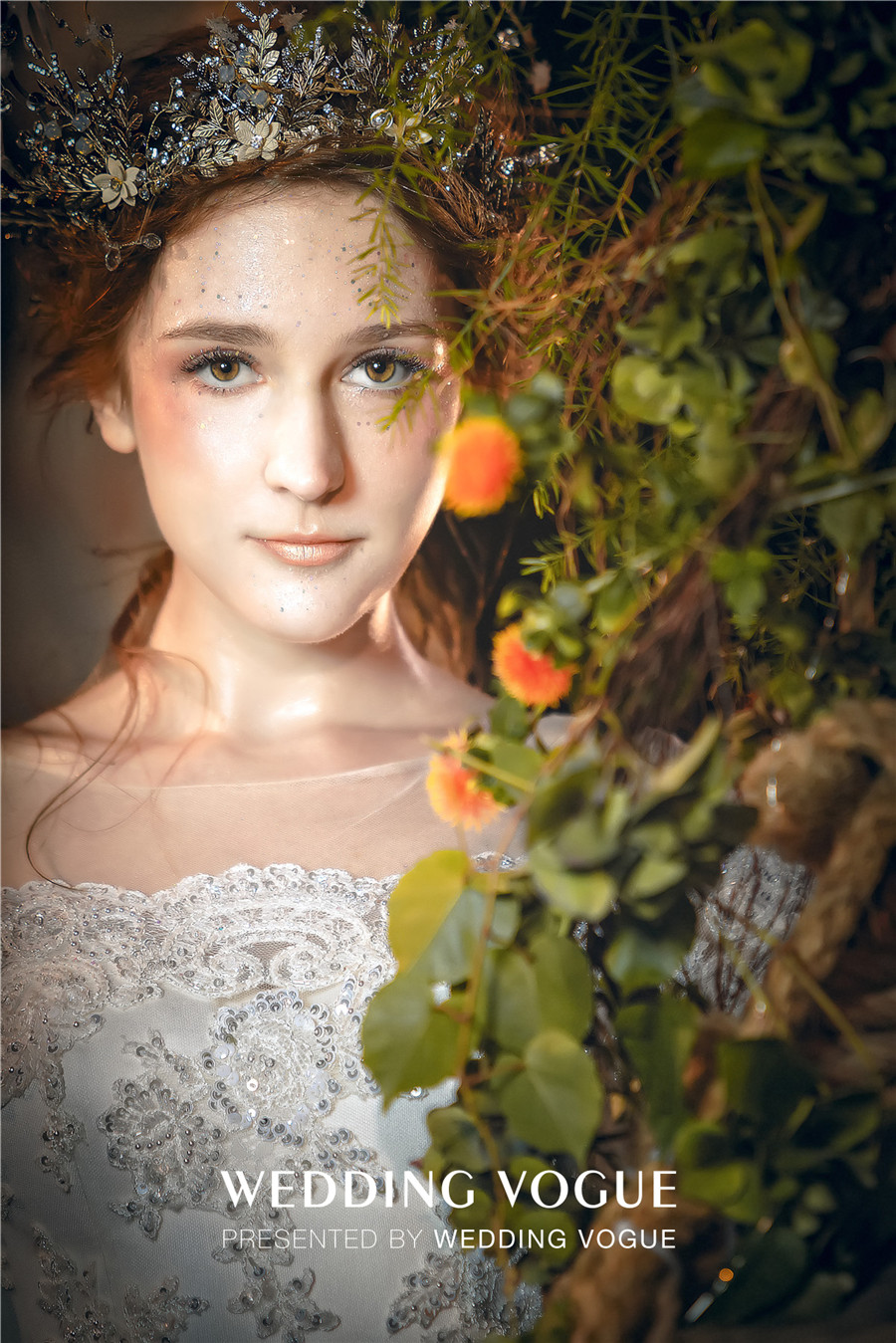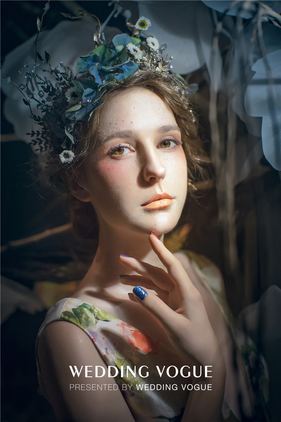 在妆容造型上用了比较虚幻的处理手法,整体在面的转折的时候可以到很多光泽和幻彩的感觉,契合整个梦幻的场景。头饰选取了贴近自然植物的装饰,