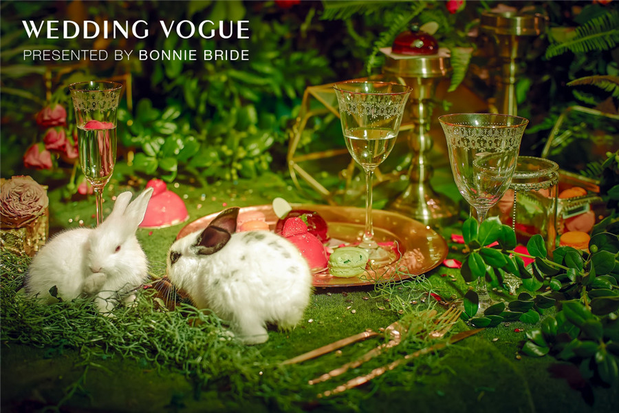 在森系的迎宾区,设计师加入了两只活泼可爱的小兔纸,打破婚礼布场上一贯的寂静,与自然紧密结合,让每个人都能够有身处大自然的感觉。水池旁边采用了透明材质取代一般常见的绿植墙,营造出一种朦胧的未知感。而光线透过这堵透明的墙,折射出丛林里阳光透过层层叶子渗透下来的光芒,为现场增添了一种自然真实的气息。