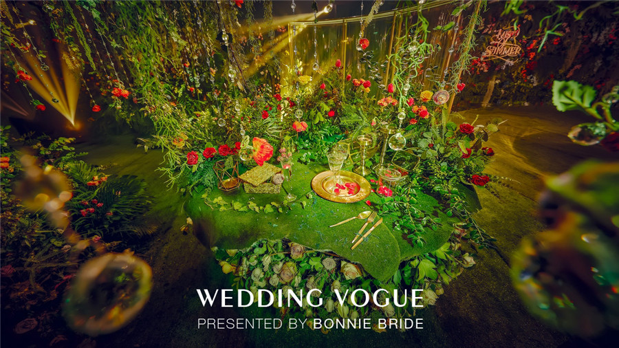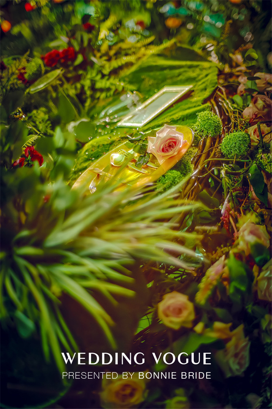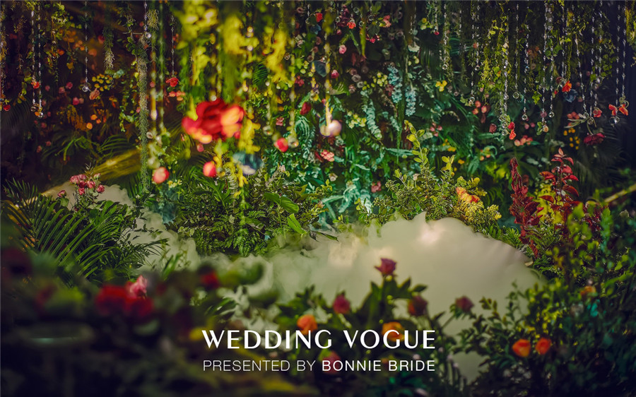 设计灵感来源于电影《西西里的美丽传说》的本次婚礼秀,被设计师划分为室外迎宾区及室内主舞台两个区域进行打造。迎宾区就像一个生机盎然的丛林,在丛林深处有个一湾清泉,洒满花瓣,周围有袅袅烟雾。