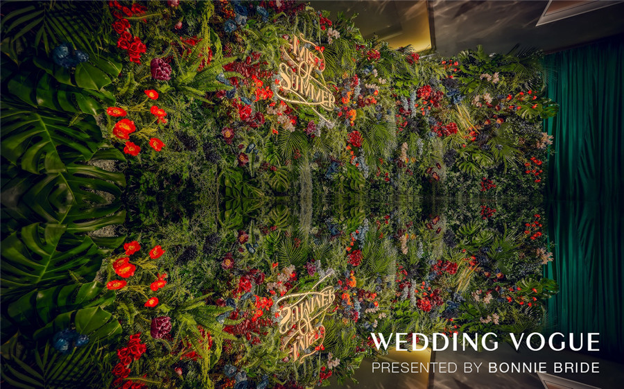 在迎宾区和宴会区之间则用了一面铺满蓬勃生命力的鲜花墙作为过渡,用蜿蜒的花墙将前所未知的秘境带到你眼前。