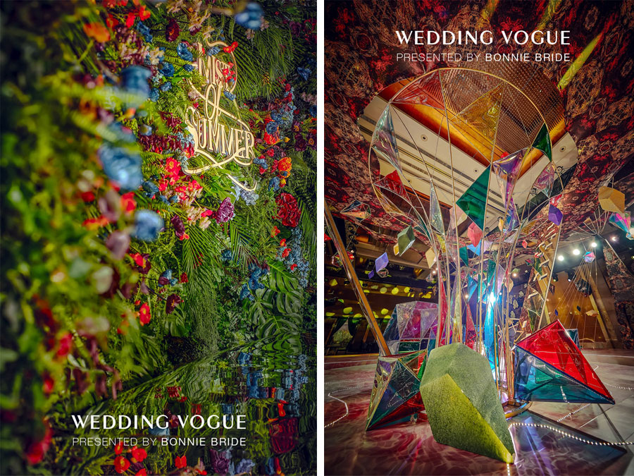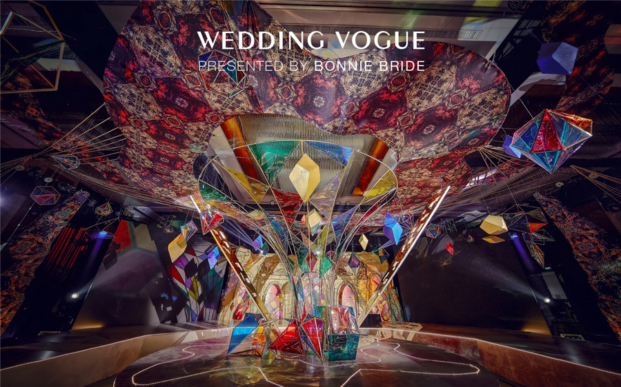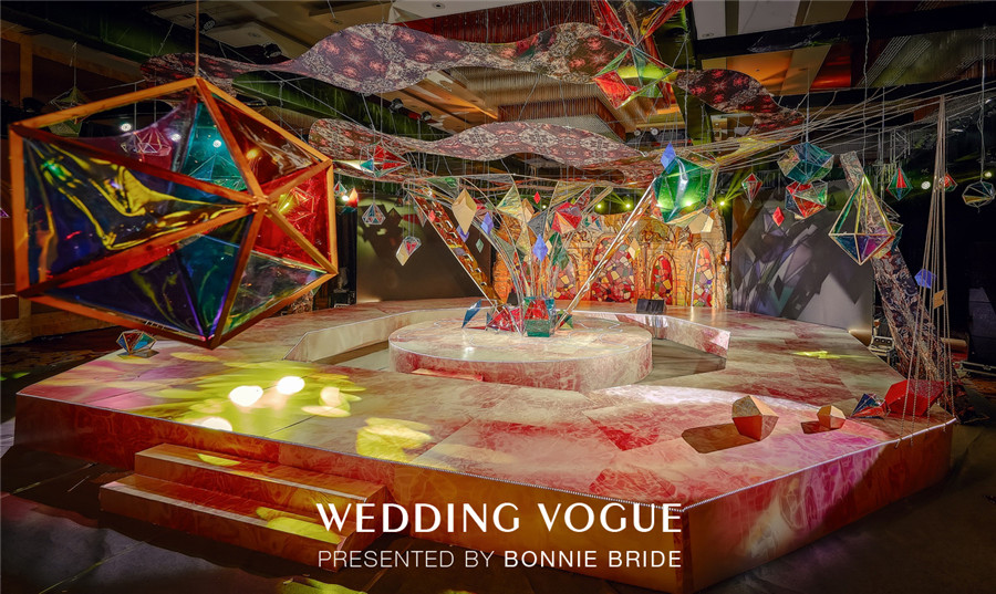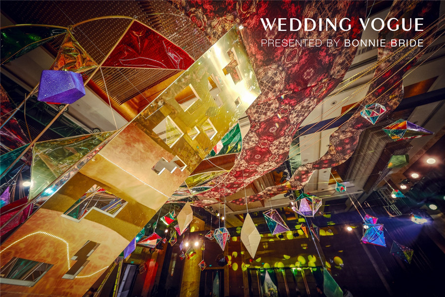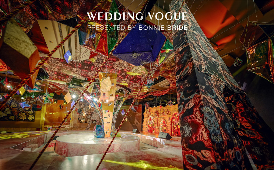 在这两个区域里面,设计师都运用到大量的光线,外区的光线朦胧自然,内区则犹如万花筒中的斑斓光影。伯妮希望通过这些光影,让观看者在缤纷之间静下心来,去聆听光影中的故事,去感受美,去感受婚礼的美丽,感受伯妮的魅力。