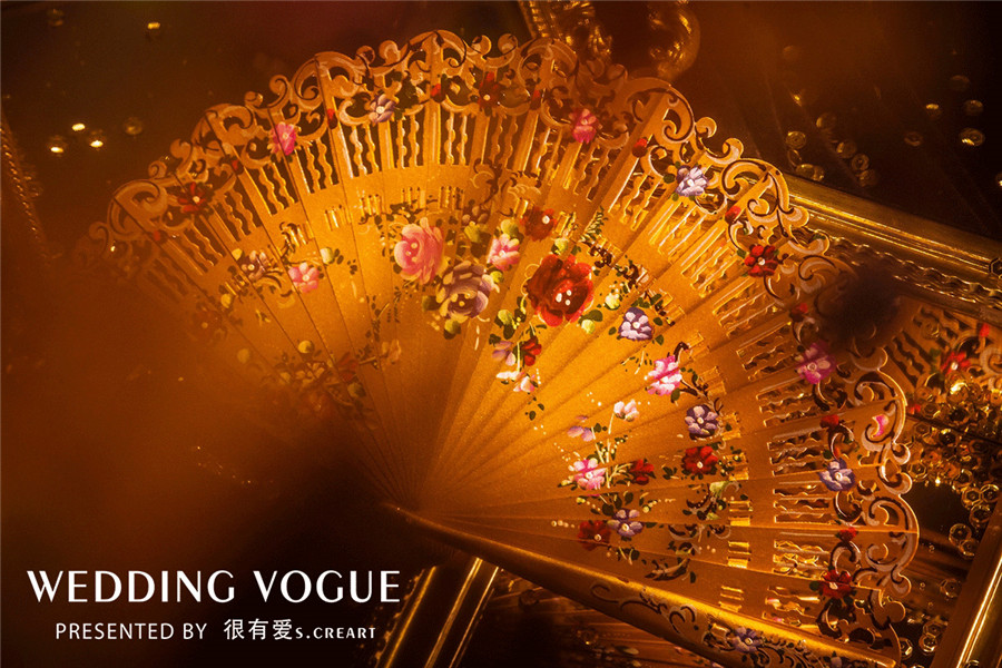 而伴手礼则是一把配以红色丝绒盒的金色/银色木扇。两把木扇外形线条灵动,各具特色的镂空纹路配上艳丽的花束纹路装点,整体复古精巧富有质感。