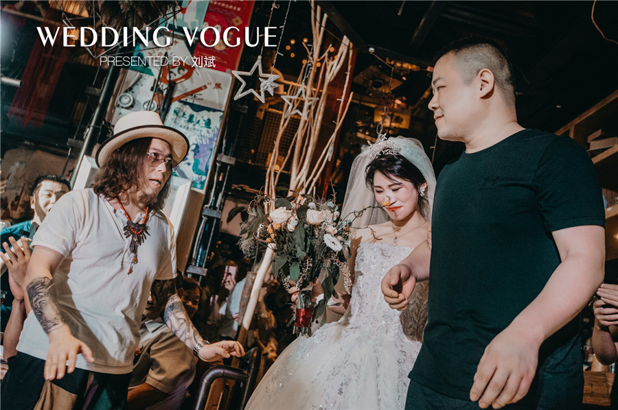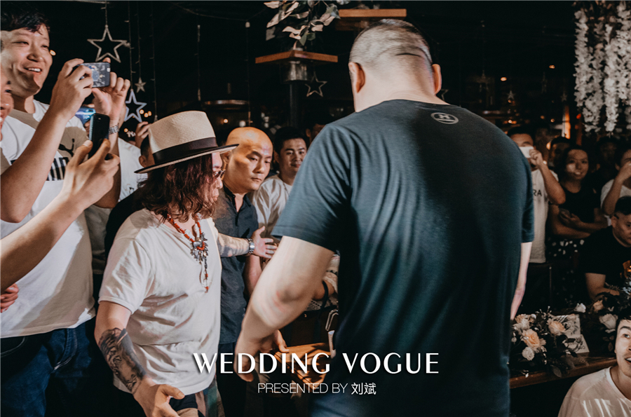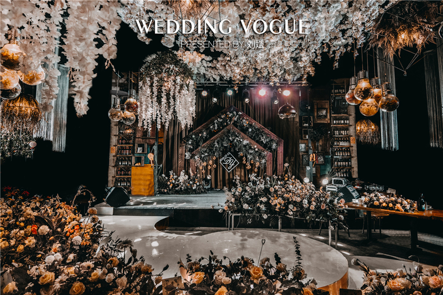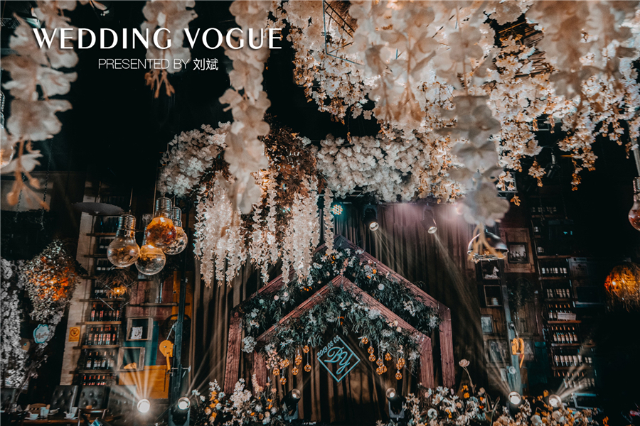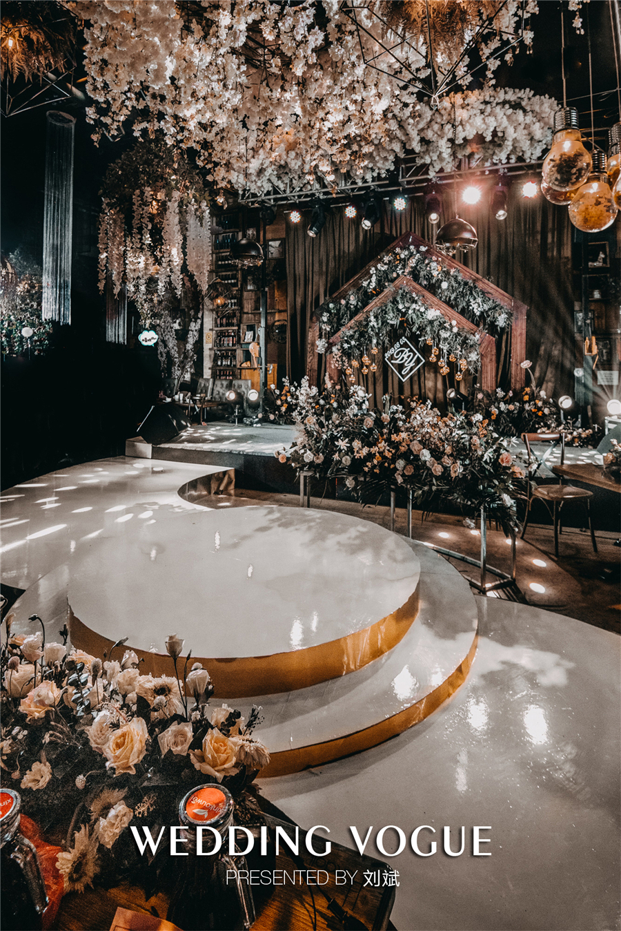 这场火爆全网的婚礼由刘斌·空间宴会设计Studio的创始人刘斌来亲自操刀。婚礼位于当地的胡桃里音乐酒馆。刘斌第一次看到现场的时候还挺担心的,因为现场很多布置和摆设都是固定的,受场地限制性很大。