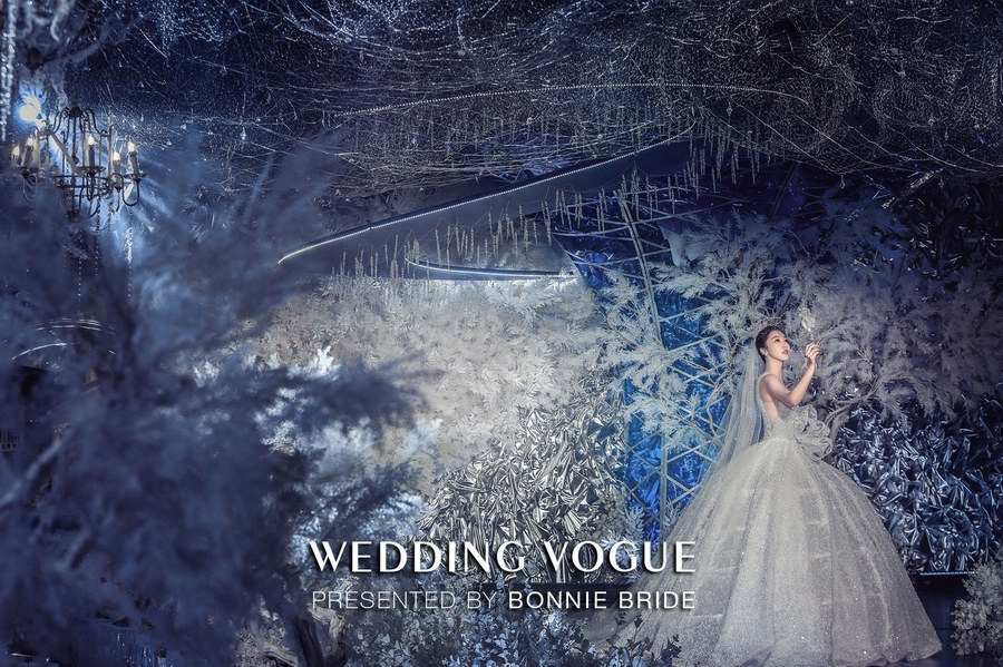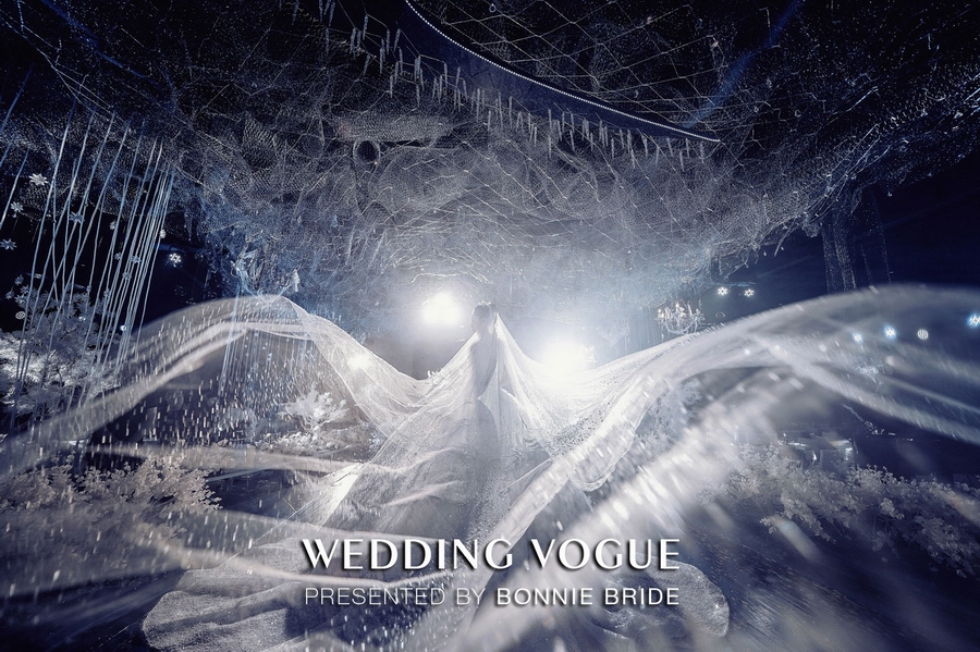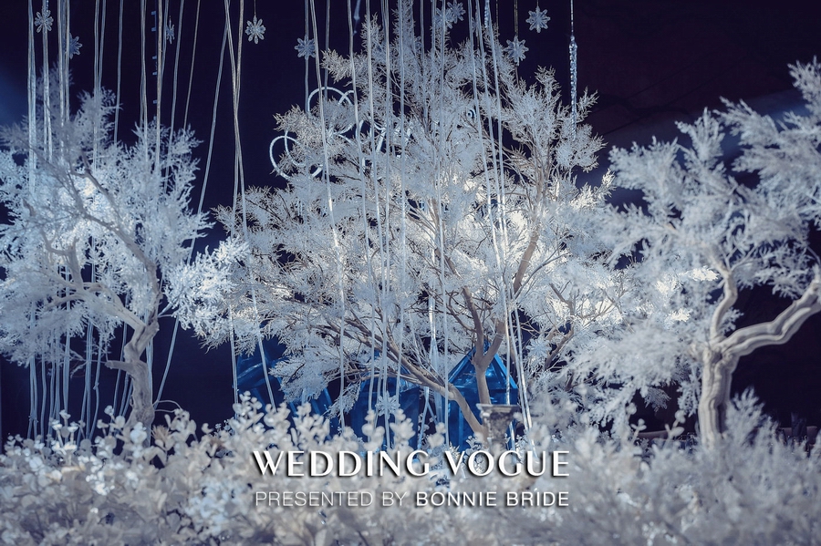 因为一对新人相恋于冬季的波士顿,同时也是在突变的漫天大雪中最终确定了彼此,所以在宴会厅内的设计风格也随着新人爱情轨迹的变化,再现了那一片冰雪天地。