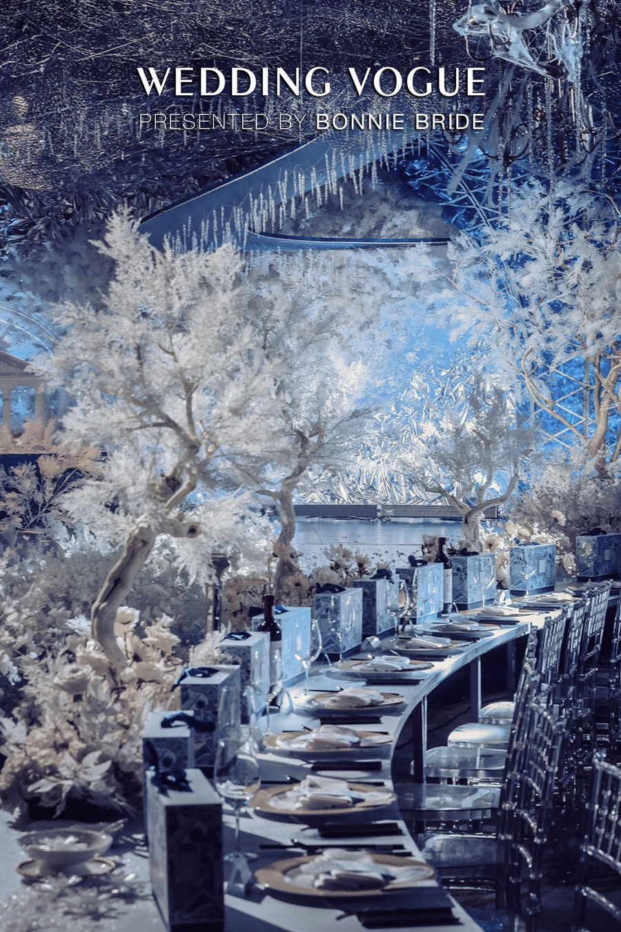 两条弧形长条桌像是被白色的冰雪覆盖的河流,蜿蜒于T台的两侧。为了能够搭配宴会厅内整体的设计,不仅宾客的椅子也特意挑选了全透明的材质,就连餐盘上也都被冰雪覆盖,以此来契合冰雪晶莹的观感。