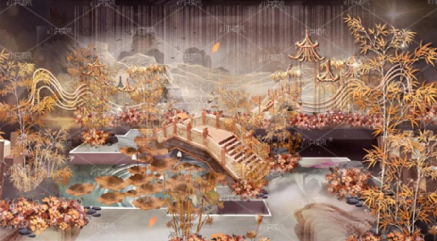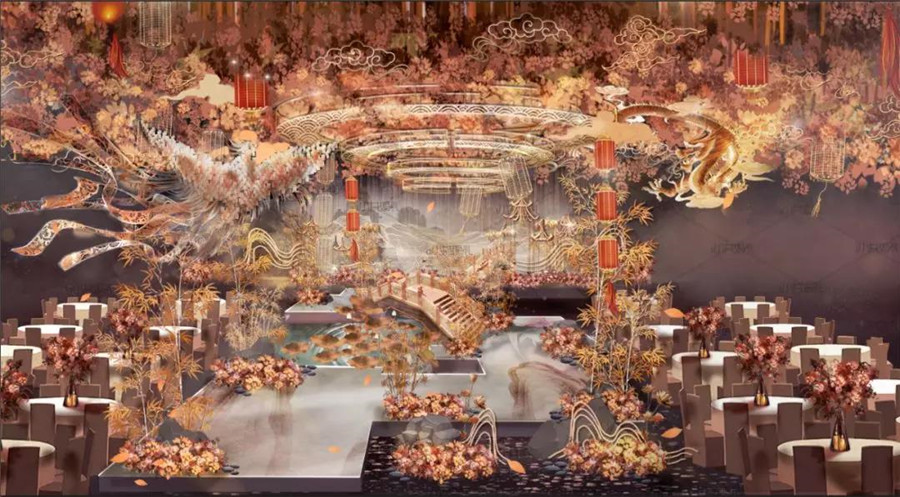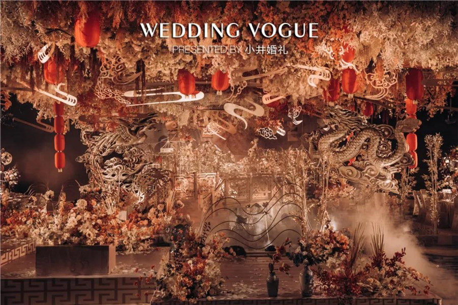 中式色彩讲究以阴阳平衡概念来调和生态之美,所以在确定这场婚礼的色调时小井婚礼重新定义了中式色彩的运用:将云峰白相对沙石黄,在一高一低之间展现了浑色的天然;而美人焦糖则温婉了龙睛鱼红的果毅,一强一弱之下做到了通透有度的空间层次,最后则使全场的殷红的 柔“阴”碰撞了金盏黄的刚“阳”,让视觉的反差在游走在平衡之间。