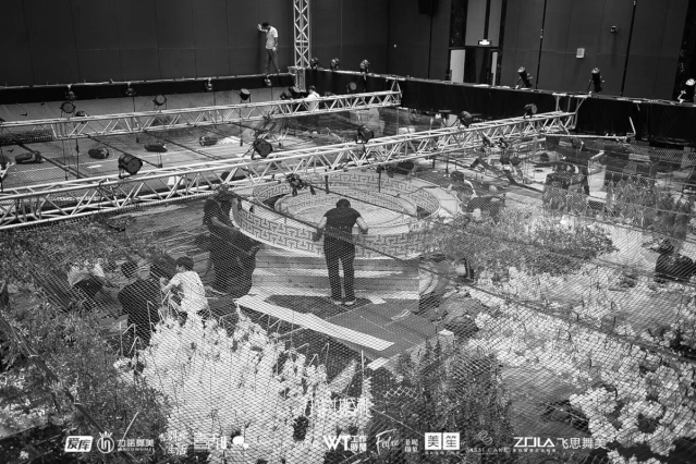 古人总说“天圆地方”:“天”有风雨雷电,“圆”有通变趋时,可称为变换之动;“地”有山水河流,“方”有稳定方正,可称为安稳之静。所以厅内主场景以最基本几何图形“圆”为全场顶部设计,意表达柔和圆满之美;底部则以“方”做异性舞台设计,取安逸、稳定之意。