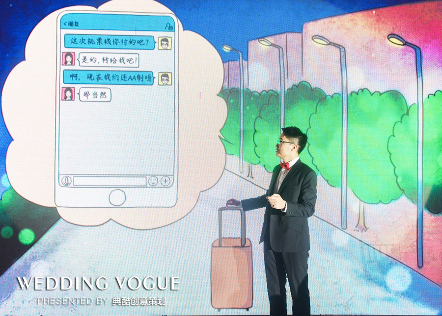 因为看惯了千篇一律的婚礼环节,新郎不想自己的婚礼也是复制黏贴的版本,所以在婚礼仪式上,他也在不断追求创新。在新郎新娘出场环节,新郎首先从主舞台取下一张高铁票,一段舞台剧从这里开始上演,再利用现场主舞台的大屏,与现代科技结合,新娘在屏幕外实时与屏幕上显示的内容互动,默契演绎两人的爱情故事。在这段舞台剧中,男主是他,女主是她。