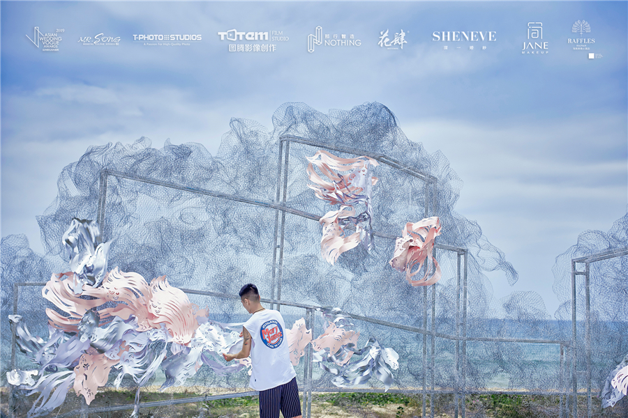 悬空地面30公分的云朵铁艺造型主背景,灵感源于海南晚霞时的火烧云,是张小松6月在酒店踩点时的灵感。而搭配铁艺结构的造型是纸雕设计。