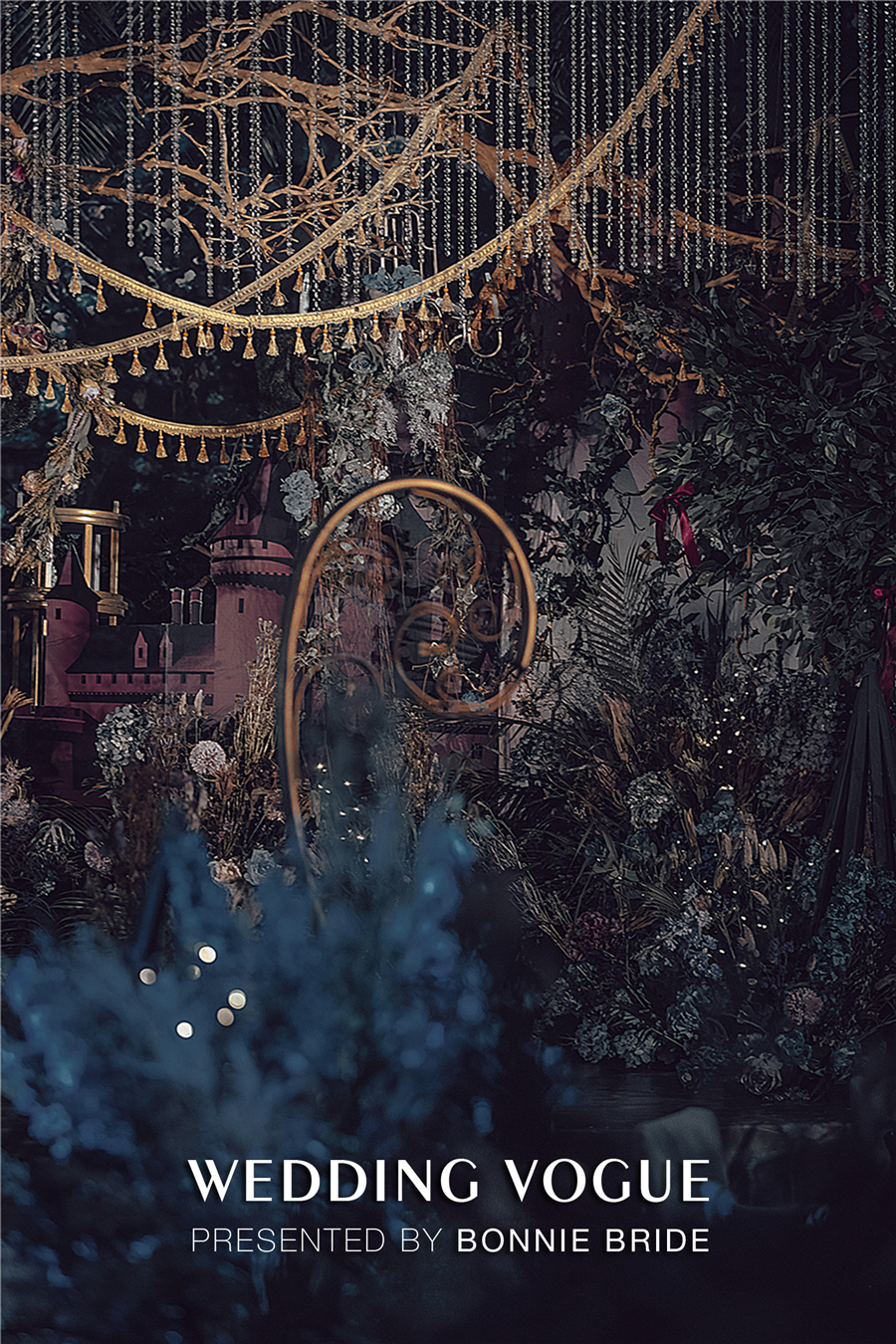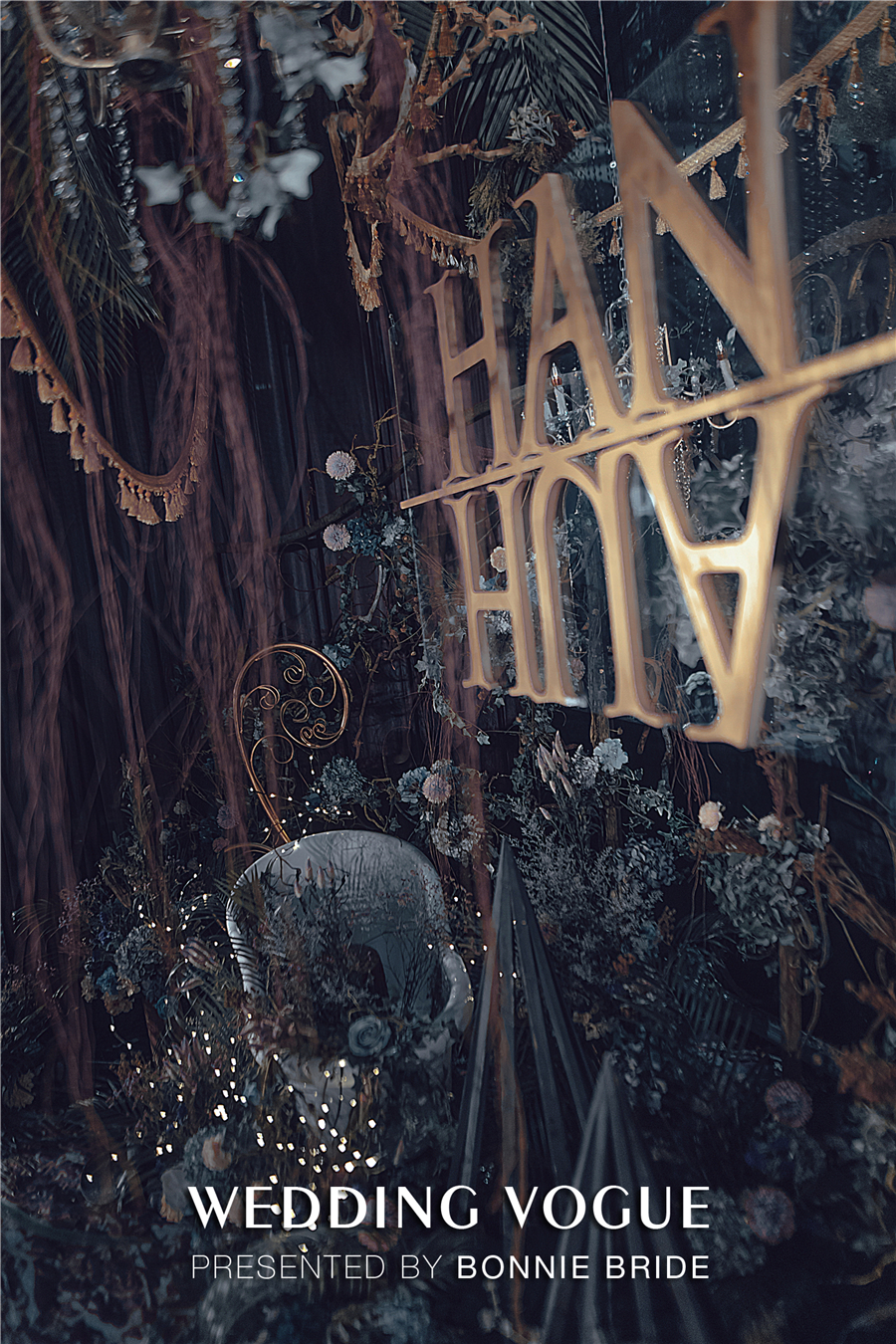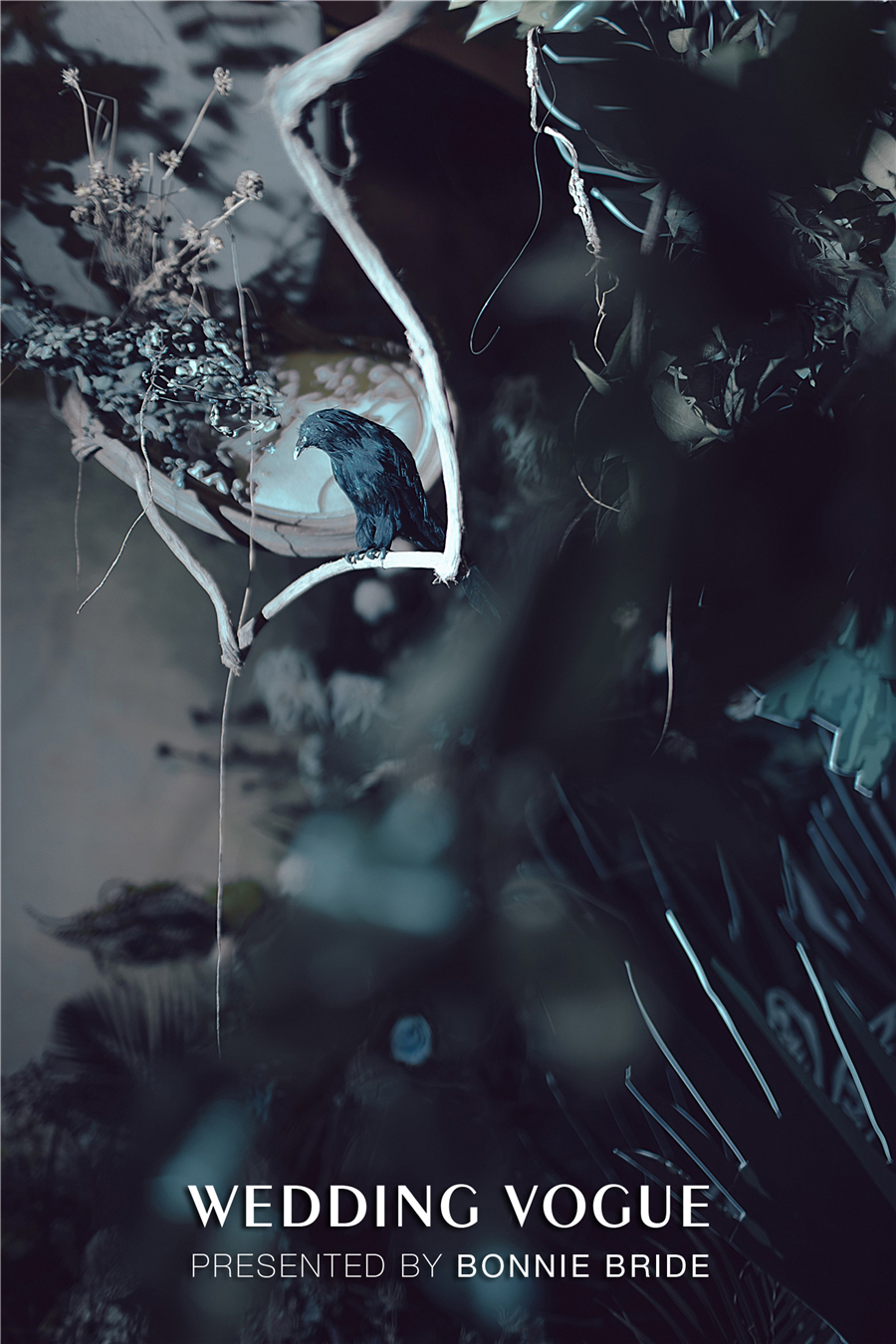 本次的婚礼设计师以哥特风和超现实主义的魔幻感觉为整体风格导向。为了凸显暗黑颓败的氛围感,婚礼的整体色调沿用《HAUTING》以黑色、灰蓝、墨绿暗红为主。