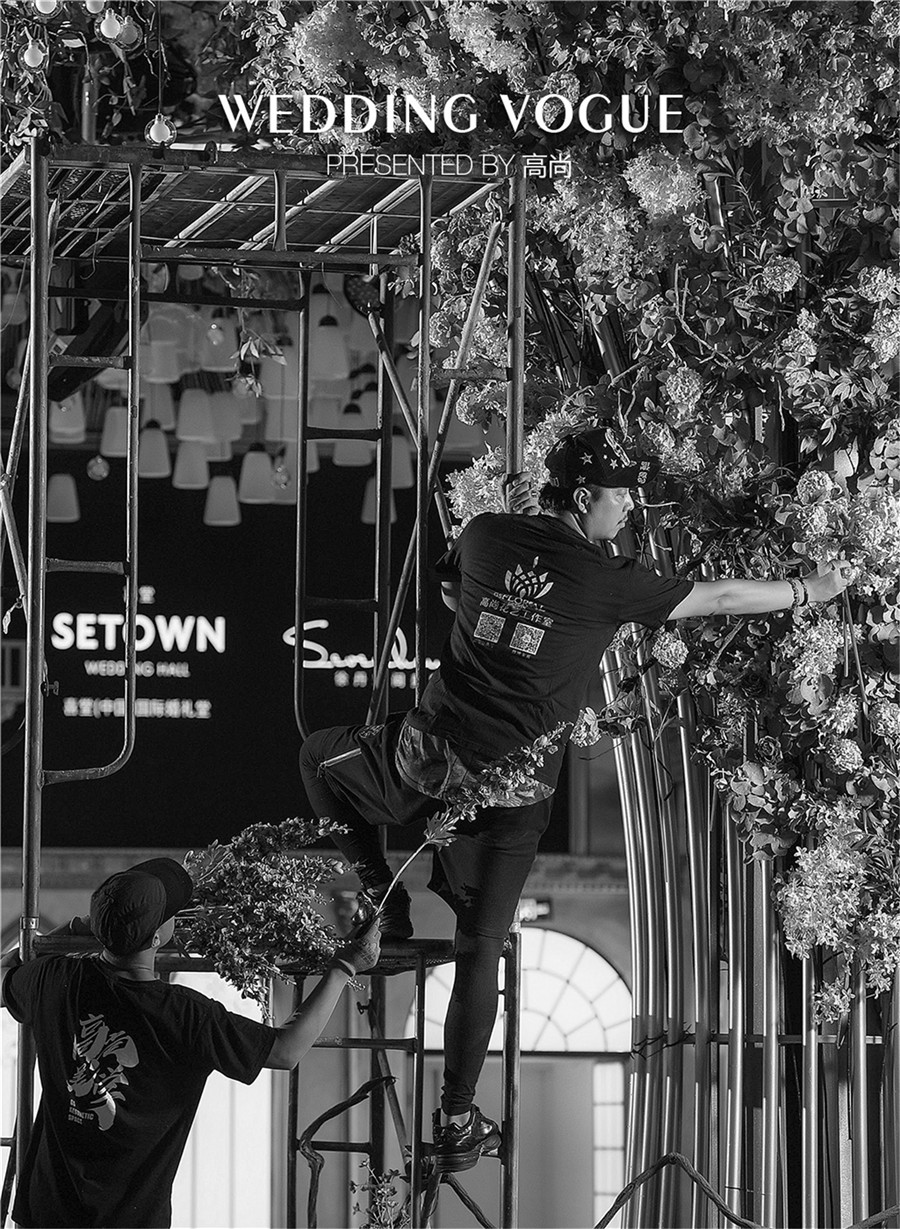 比如因为时间太短,花艺的工程量特别大,花艺设计师高尚特别从深圳、长沙各地号召了7、8个学生过来帮忙。为了追求品质和完美,72个小时,30多个花艺工作人员,在现场高效运转。