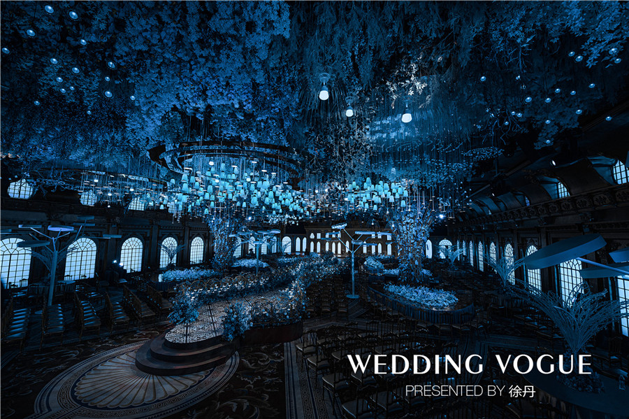 现场更是用到了几十万朵的花艺点缀组成了唯美梦幻的蓝色森林。花艺设计师高尚表示其实现场花艺用到的蓝色并不仅仅是一种,包括灰蓝、宝蓝、天蓝、淡蓝、湖蓝等多达5种,整个空间的花艺特别的具有层次感,和整个婚礼现场完美的融合。