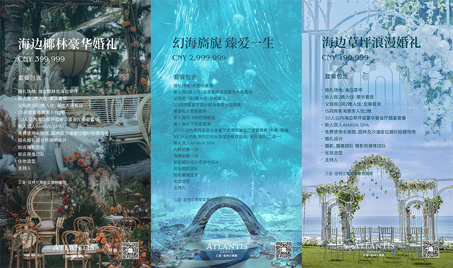 现在,三亚·亚特兰蒂斯也分别针对酒店的3个特色婚宴场地,为钟意大使环礁湖、椰林草坪、海边草坪的新人,推出了3款特别婚礼套餐,以满足大家对于梦幻婚礼的不同需求。