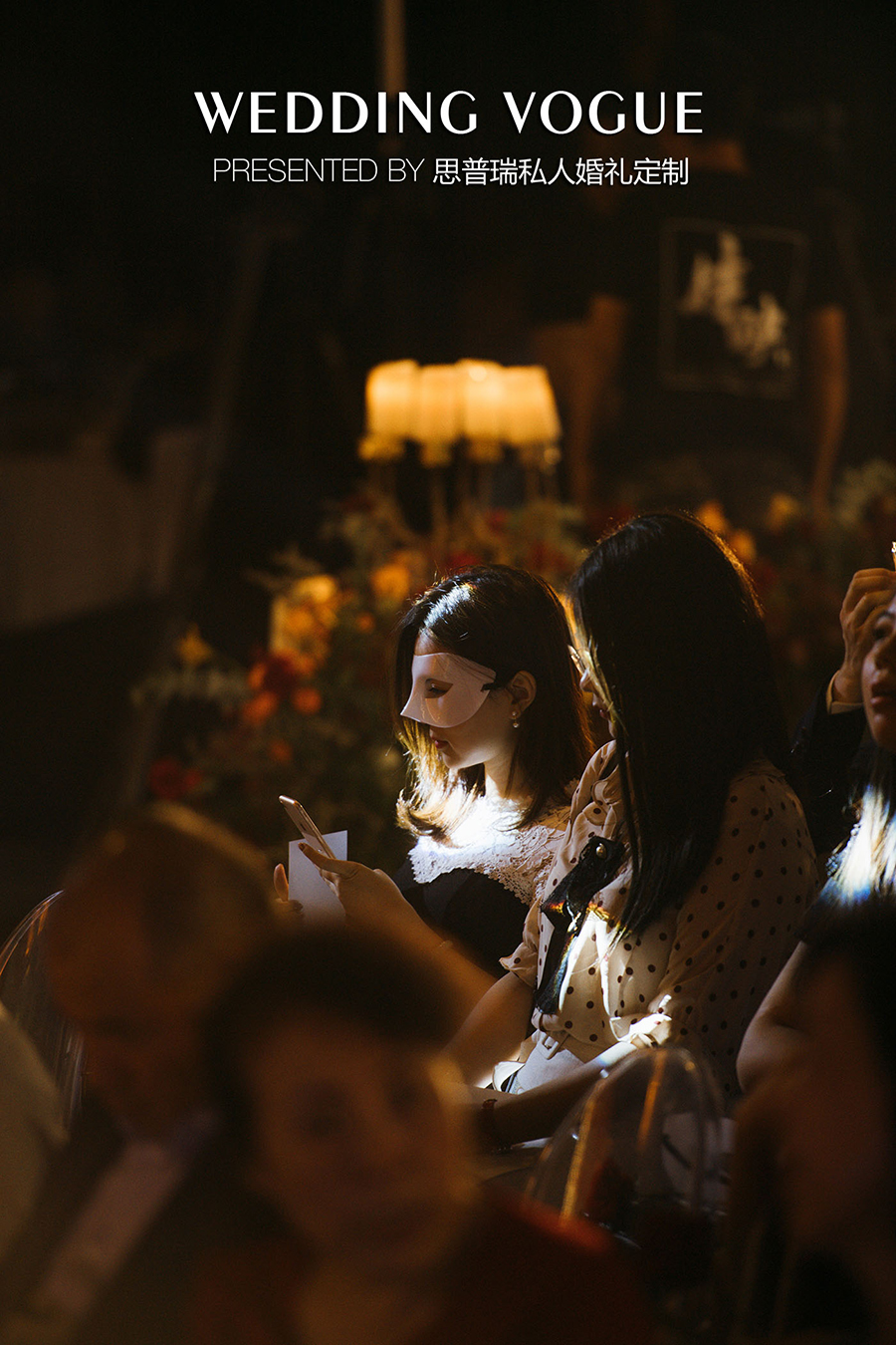 50分钟的婚礼,观众戴着面具坐在幽灵椅上,轻嗅着玫瑰,欣赏新娘特地为婚礼学的舞蹈《芳华》,还有新郎带来的歌曲《爱的代价》,观众们从纪录片里了解新人的童年、少年、梦想、爱恋。
