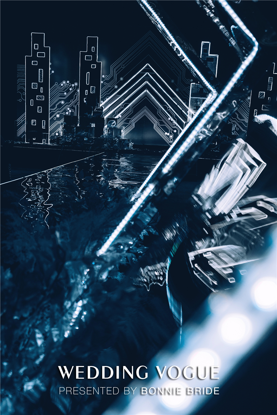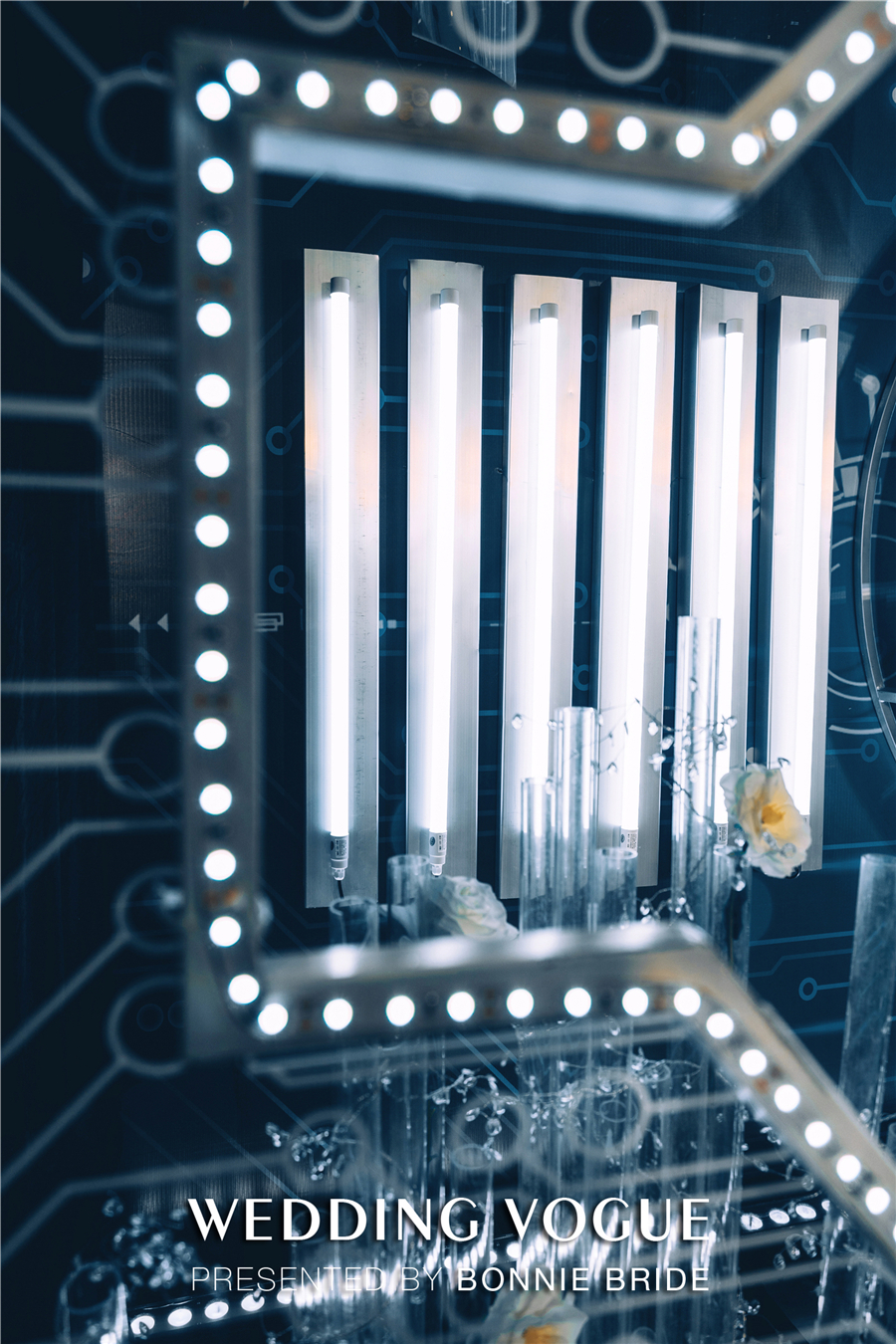 有别于婚礼中火红的炽烈、粉色的甜美,这场以冷冽的蓝黑色为主色调的婚礼,在金属、有机玻璃、冷LED灯带的组合下,充满了科技感。在这个如同未来的、略带迷幻的空间中,似乎在表达着:时钟的跳动变得快速