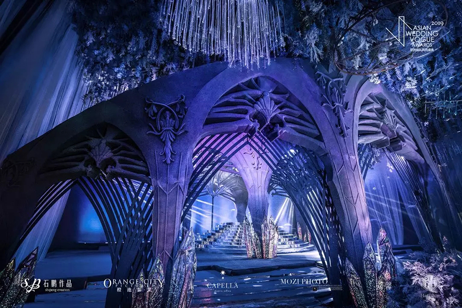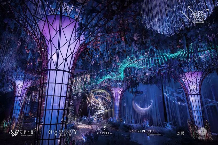融万物自然与科技之美,融万物于爱,在石鹏宴会发布《融》的设计中,宴会厅顶部是天空,融合了浩瀚星辰;下方是大海,包容万物生命。回归自然,拥抱科技,展示出婚礼最初的本质。
