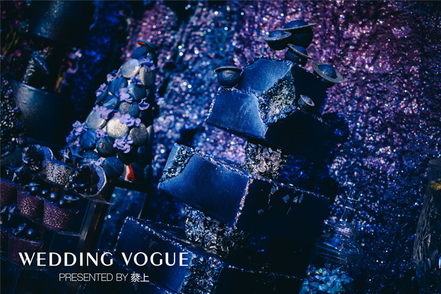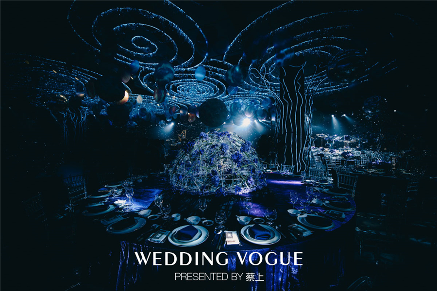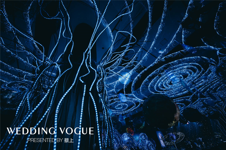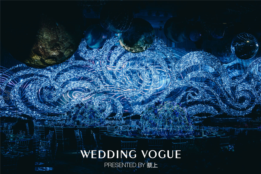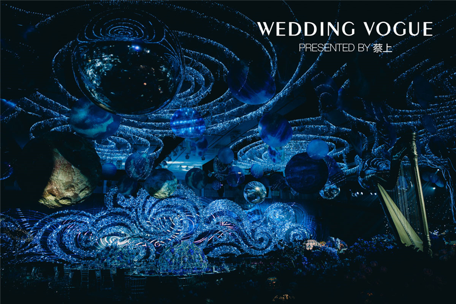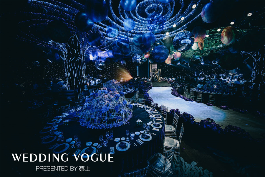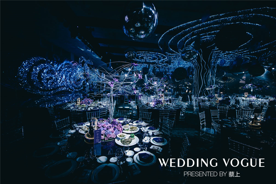 这场婚礼的宴会设计统筹蔡上对于整场婚礼的诠释是,灵感来源于他们热爱的星空。新人自幼相识,名字中分别有光、汐两个字。这种概念长期潜伏在他大脑里,让他联想到大海与星云呈现出的潮汐。