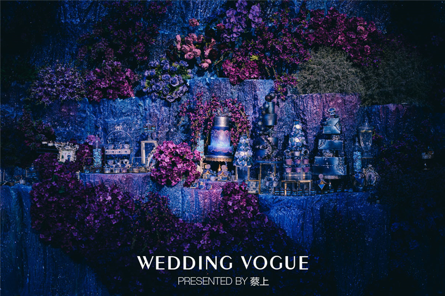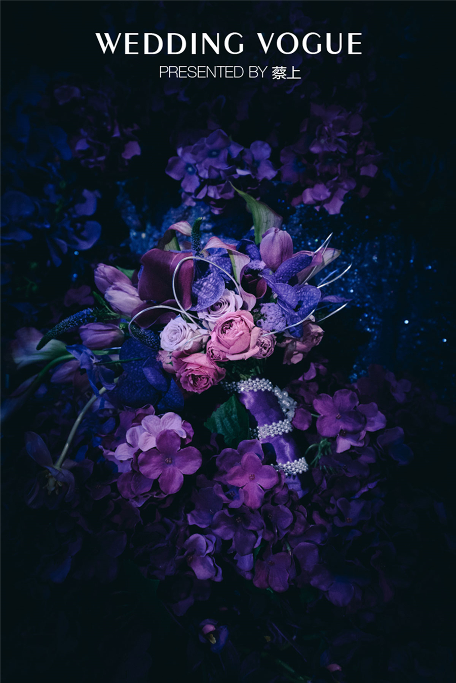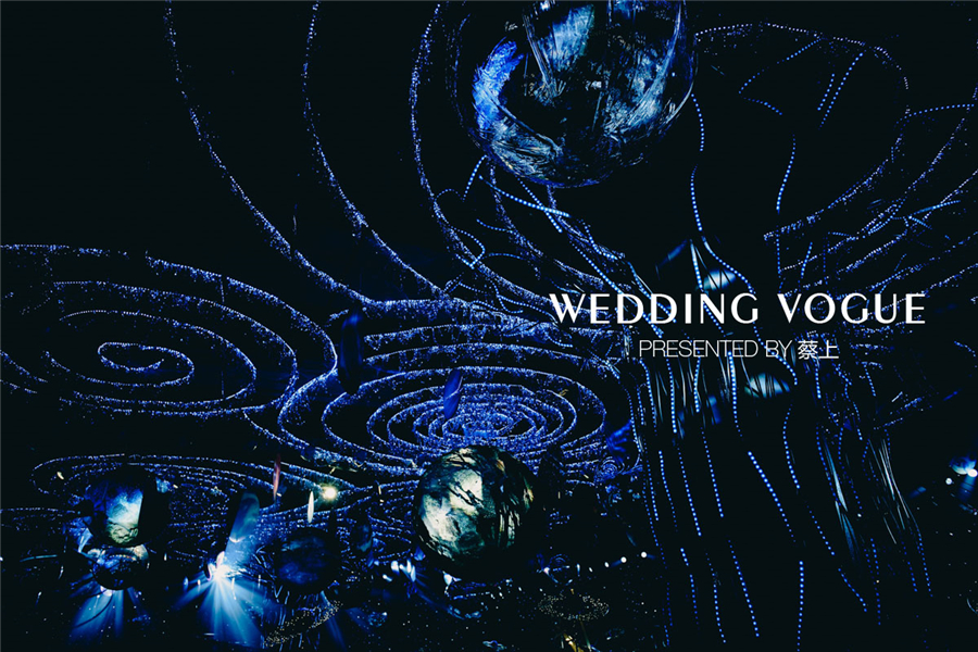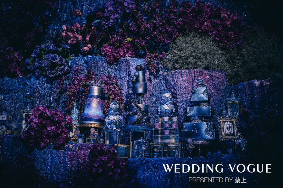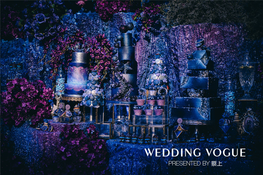这场婚礼的宴会设计统筹蔡上对于整场婚礼的诠释是,灵感来源于他们热爱的星空。新人自幼相识,名字中分别有光、汐两个字。这种概念长期潜伏在他大脑里,让他联想到大海与星云呈现出的潮汐。