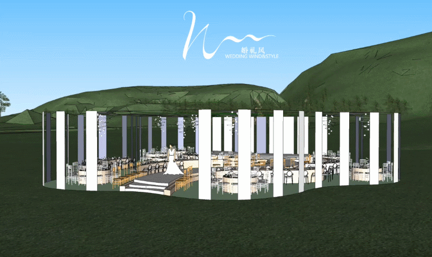 以俯视角度来看,整个婚礼仪式区、宴会区以及来宾,都被完全容纳在这一水滴中
