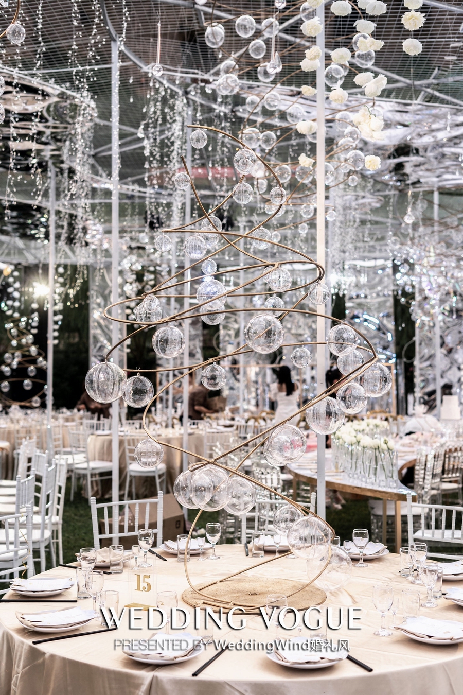 婚礼现场采用了上下双层结构,设计师在上下之间,用气泡和垂吊装置做衔接和呼应