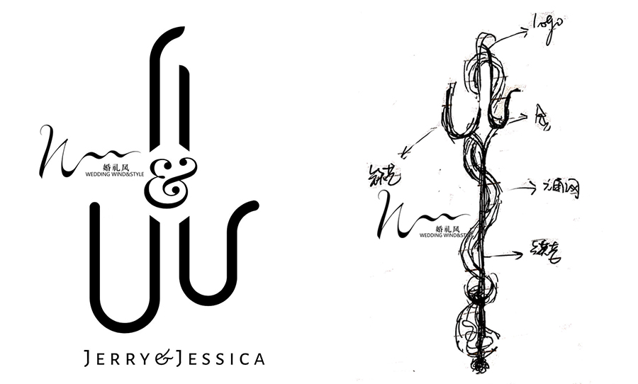 同时被用于餐盘卡和新娘手捧的主视觉婚礼logo,由两个J字母组合而成