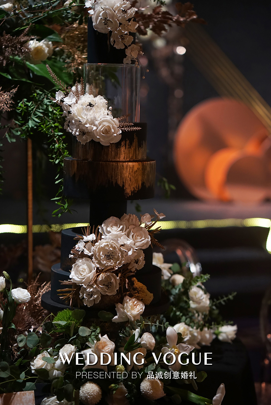 宴会现场特别使用了很多反光亮面材质,炫丽的金属感营造了时尚奢华的氛围,在哑光黑的背景上尤其引人注目,熠熠生辉。