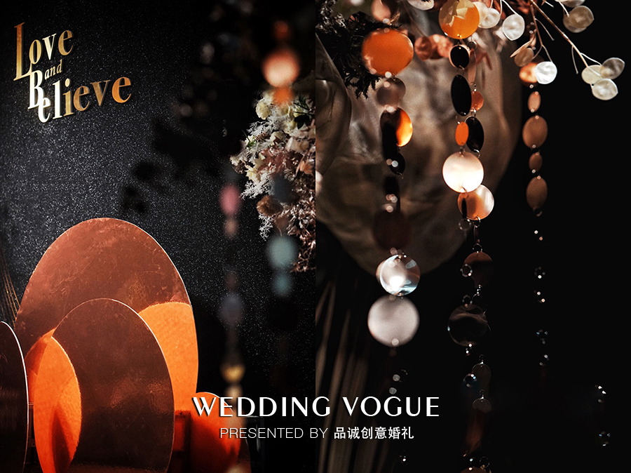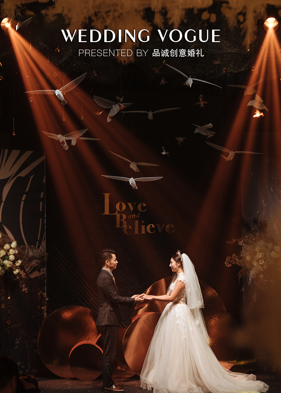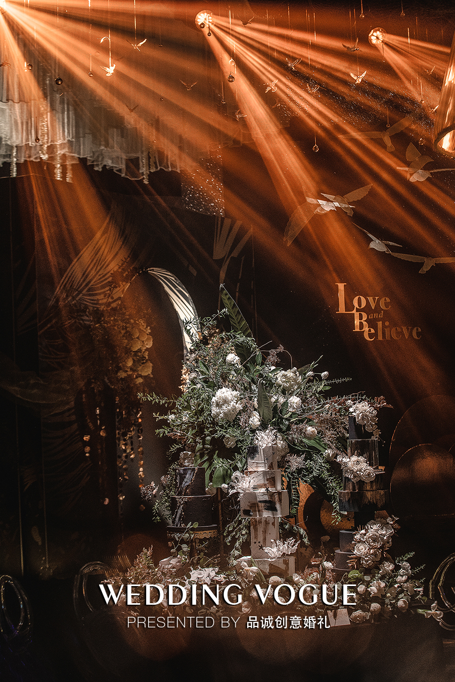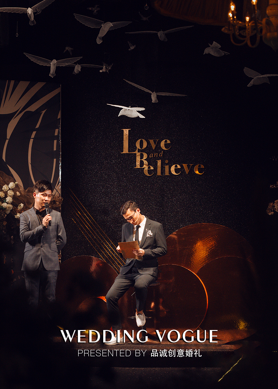 品诚创意婚礼将婚礼秀的主题命名为《爱。予诚 love&believe 》,一方面希望新人通过流程体验感受到对爱情的诚挚和初衷;另一方面也代表长久以来品诚与客人的关系:品诚因为爱被选择和相信,想把最前卫的婚礼观通过布置传达给每位来宾,人有情、布置亦有情。