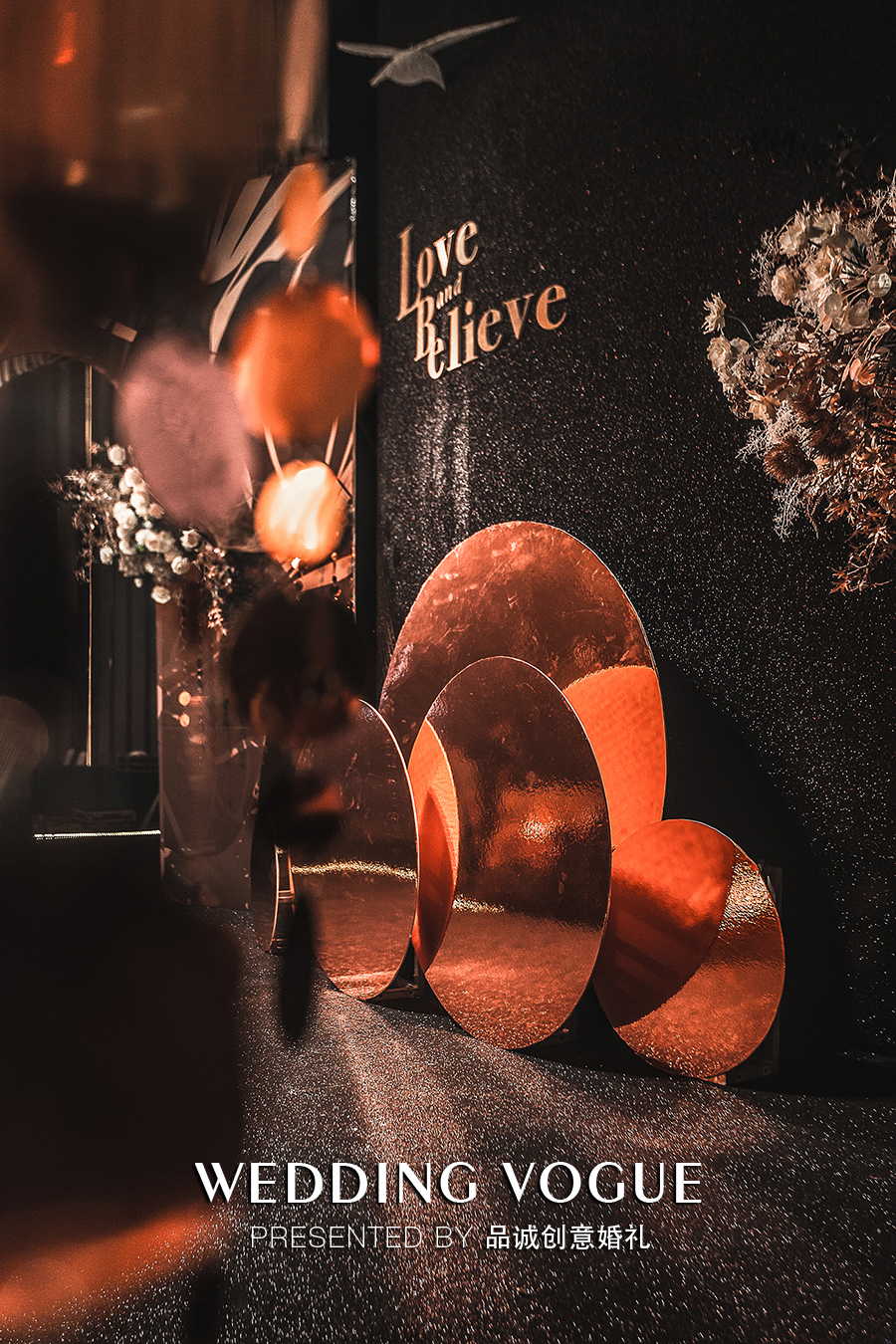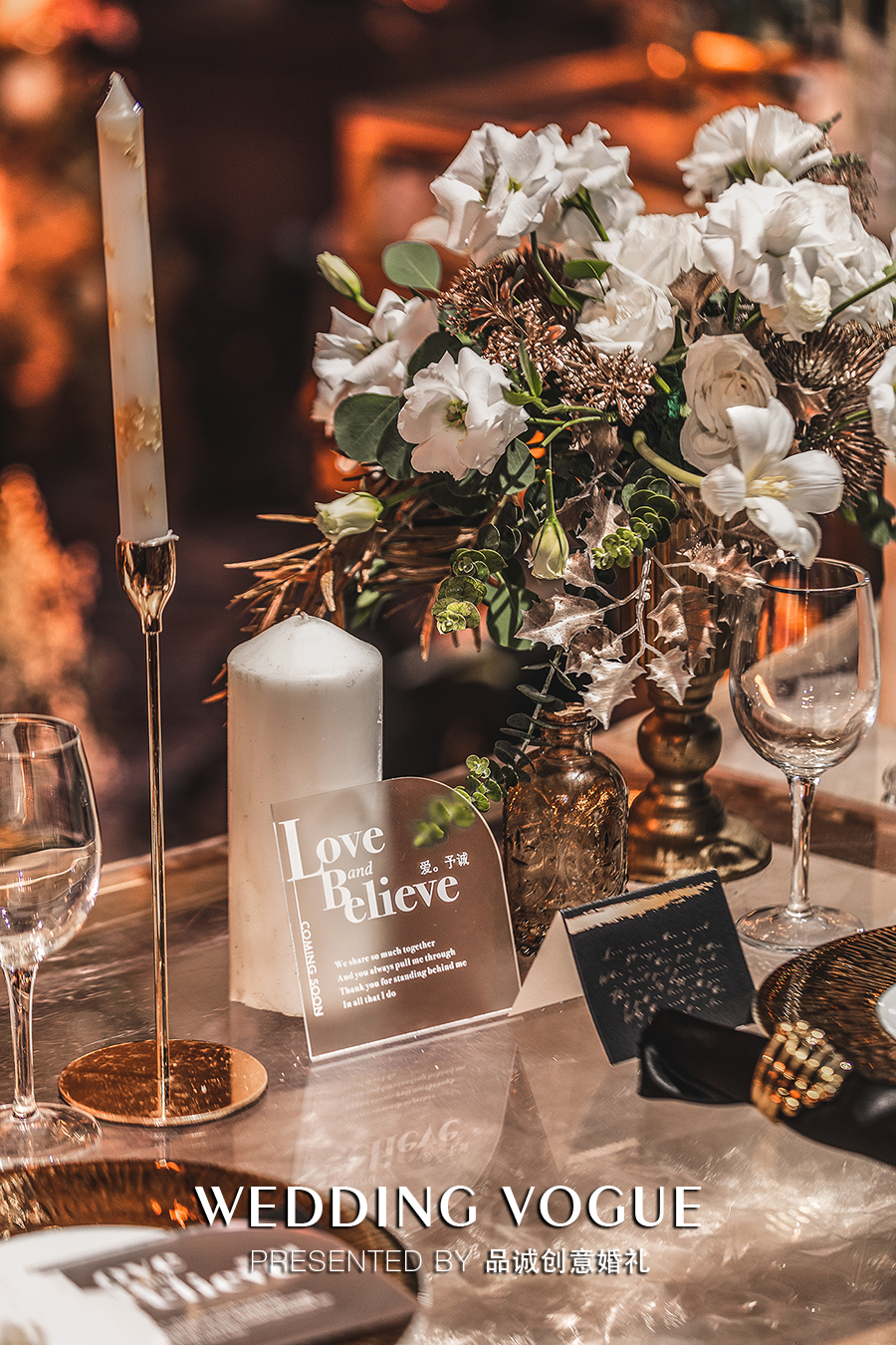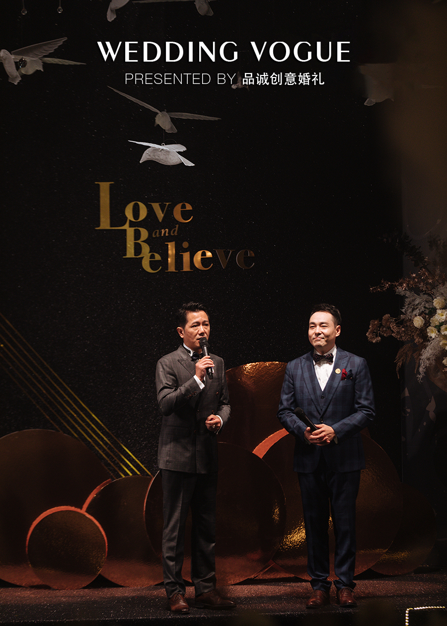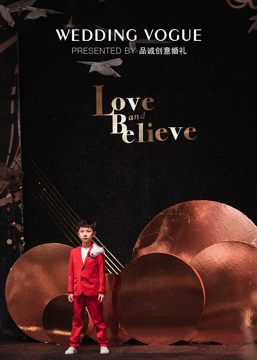 品诚创意婚礼将婚礼秀的主题命名为《爱。予诚 love&believe 》,一方面希望新人通过流程体验感受到对爱情的诚挚和初衷;另一方面也代表长久以来品诚与客人的关系:品诚因为爱被选择和相信,想把最前卫的婚礼观通过布置传达给每位来宾,人有情、布置亦有情。