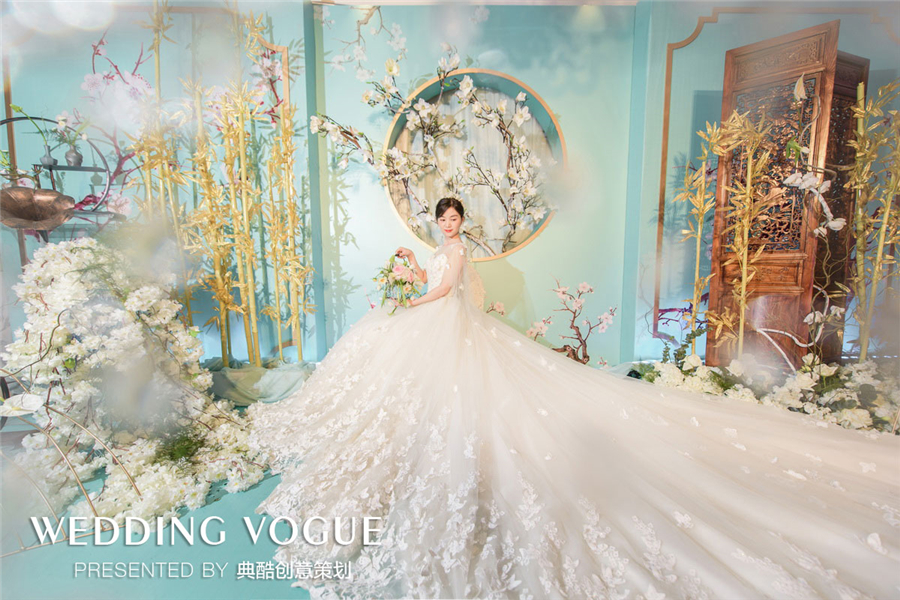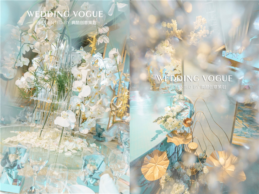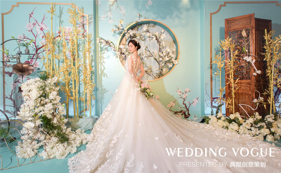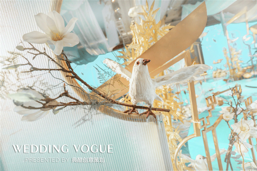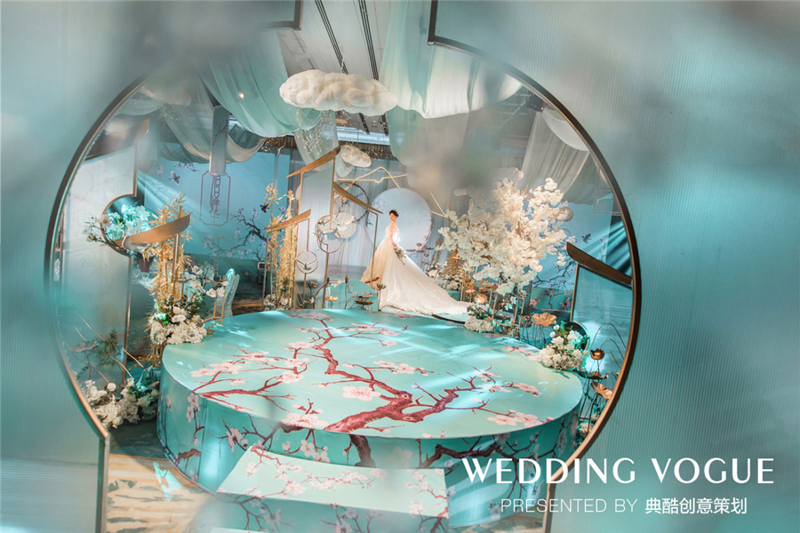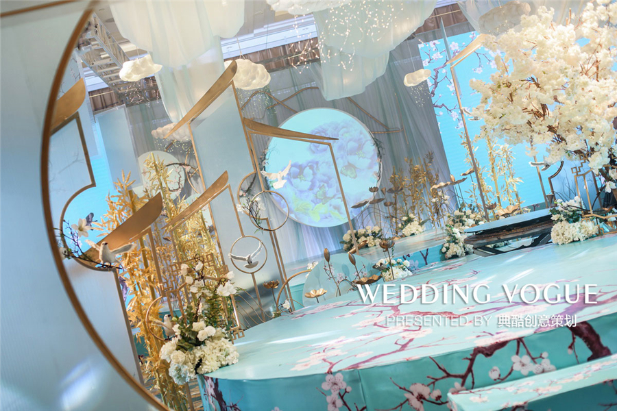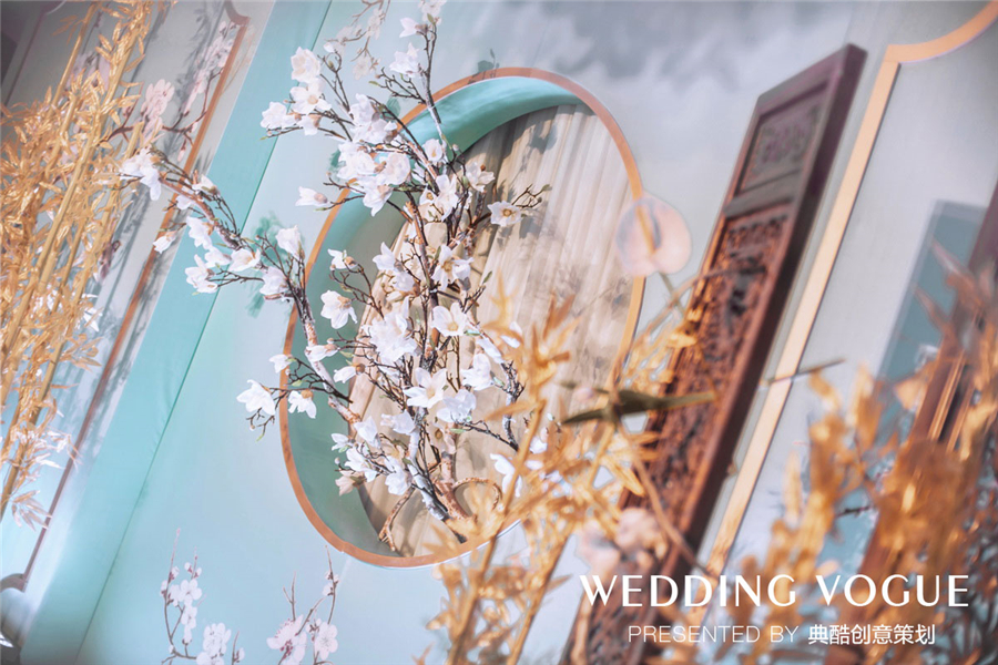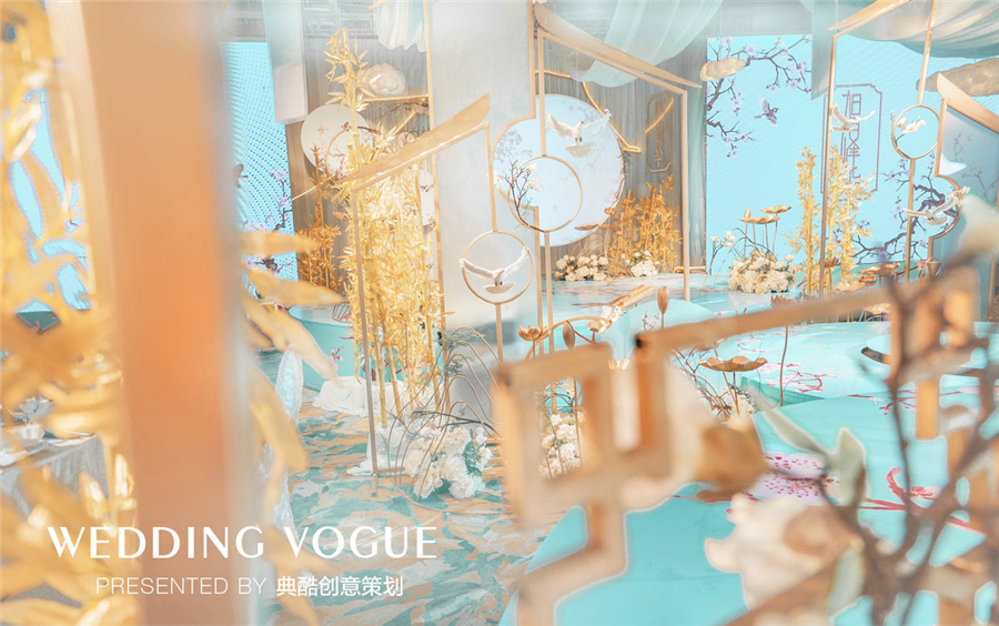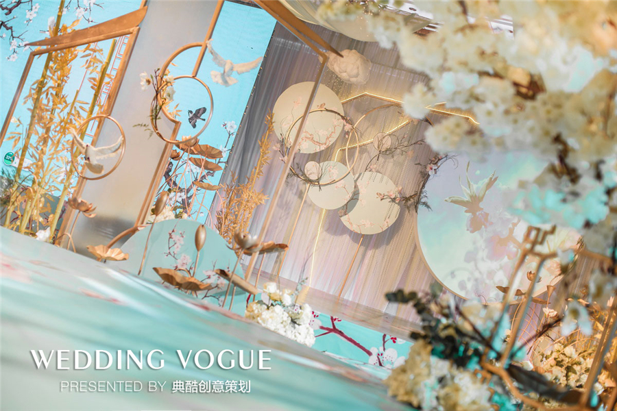 整场婚礼的布置采用了薄荷绿和白色作为主色调,象征湖泊、水汽与云朵,配以金色的仿古结构框线,修饰出楼阁、亭台、拱门、扇面的边框。