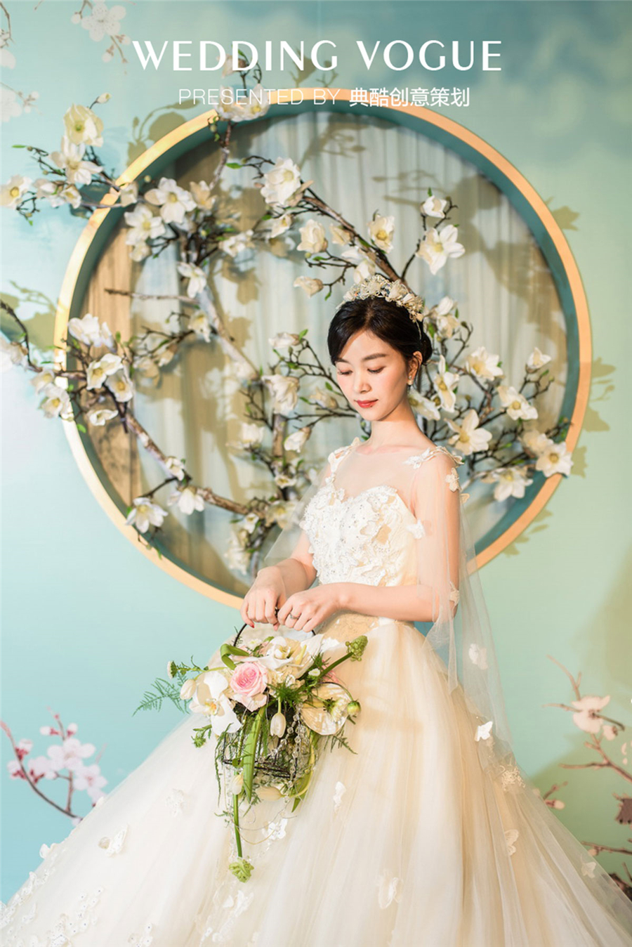 园林式的墙面、出墙的白色花朵、古典屏风和扇面,这是新人用于迎接宾客的区域,宛如这个私家园林的入口。新娘气质婉约,手提典雅的手捧花篮,背倚古典的镂空花墙,洁白婚纱与中式建筑融为一体。