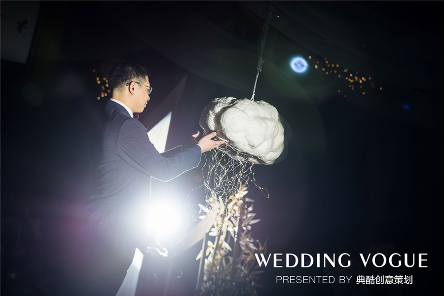 典酷创意策划为新人交换婚戒的仪式设计了一个独特的环节。新人出场完毕后,主持人引导他们一步步走向自己的幸福——两人分别从大圆出发,走向中间的旋转舞台。新人携手,旋转舞台慢慢上升,之后,从空中奇妙地飘落一朵云,戒指就藏在其中。新郎伸手从云朵中摘下戒指,为彼此戴上。