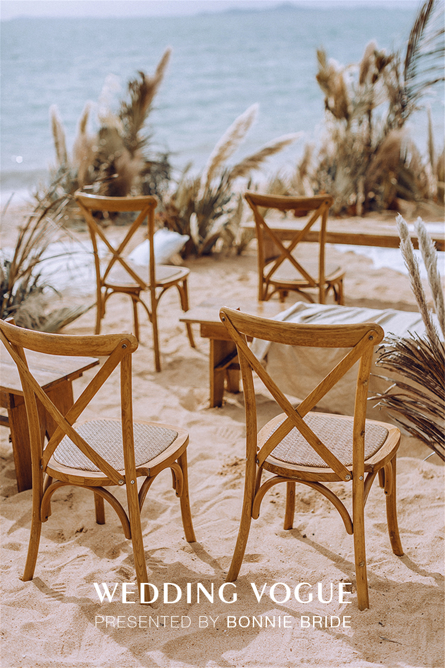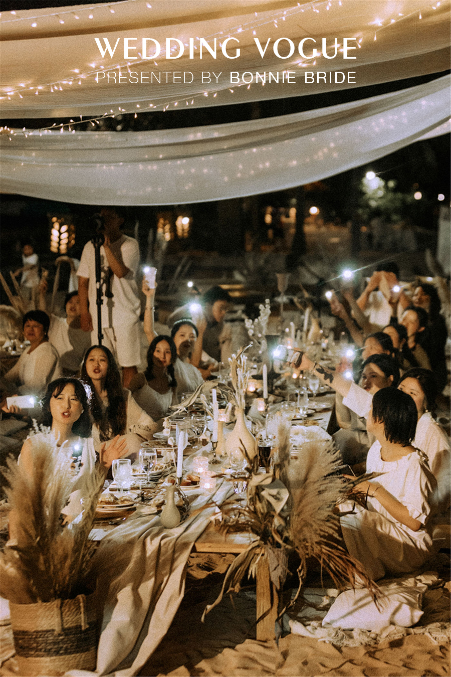极简的原木结构,顶部悬挂纯白色的轻纱,海风拂过轻纱漫舞夜幕降临之后,点点星光穿梭其中,所有的宾客全部席地而坐,感受柔然的沙滩、海风还有纯粹的爱情。