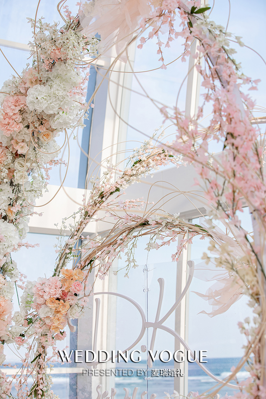 两个相互内切的圆交于一点,既是相互独立的个体,又是在情感上的交界,婚礼的形态有很多种,视觉上的美丽也是最基本的表达形式,浪漫的裸粉色奠定了美丽的基础调性,没有更多的表达方式,简单、直白变成了这场婚礼理所应当的事情。