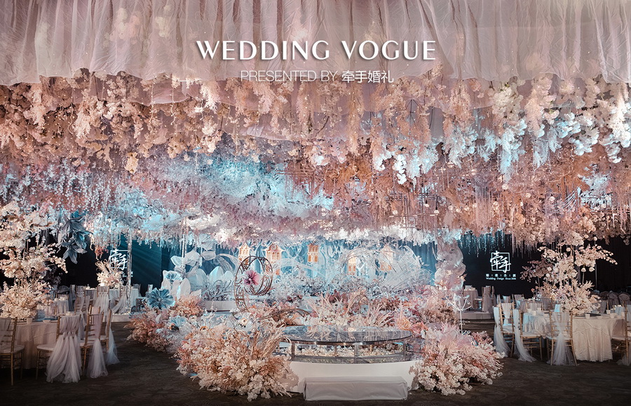 仪式区的花艺色彩我们选用裸粉色系中较为梦幻的颜色做层次搭配,淡淡的公主粉与少女樱在灯光的投射下呈现出独有的唯美与浪漫。