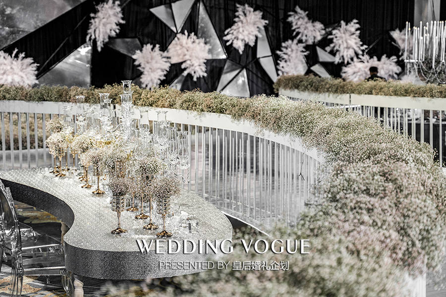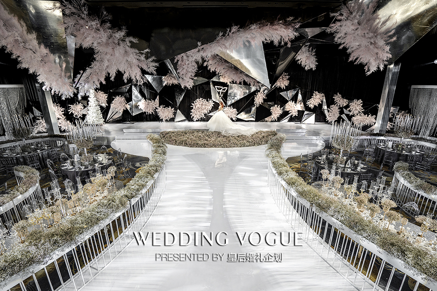 在这场以银色为设计主色调的婚礼中,皇后婚礼企划采用了低调却存在感很高的单品:镜面,来与银、白、些许的粉色相搭配,将less is more用了另一种方式作诠释