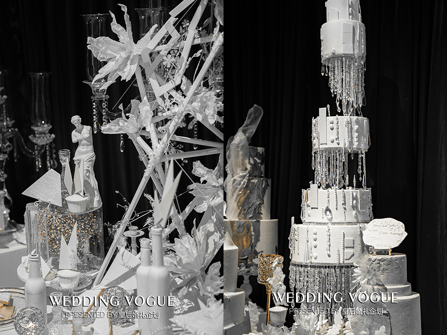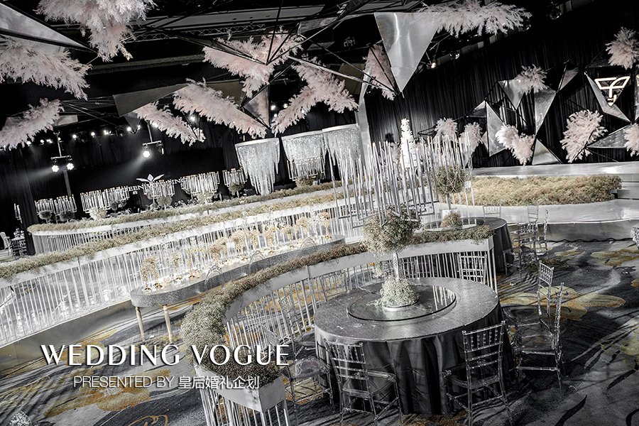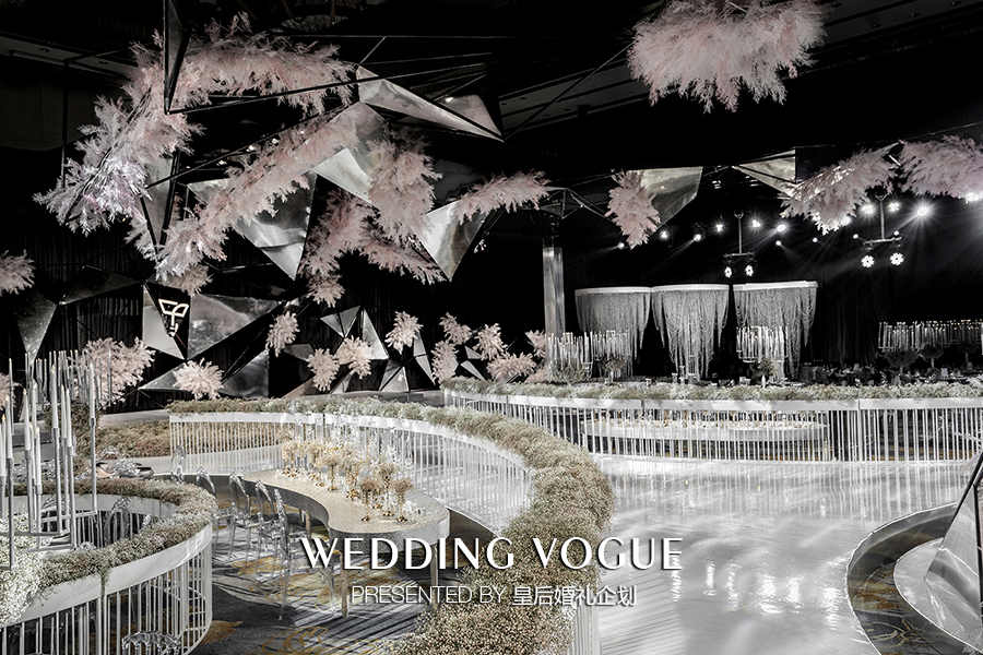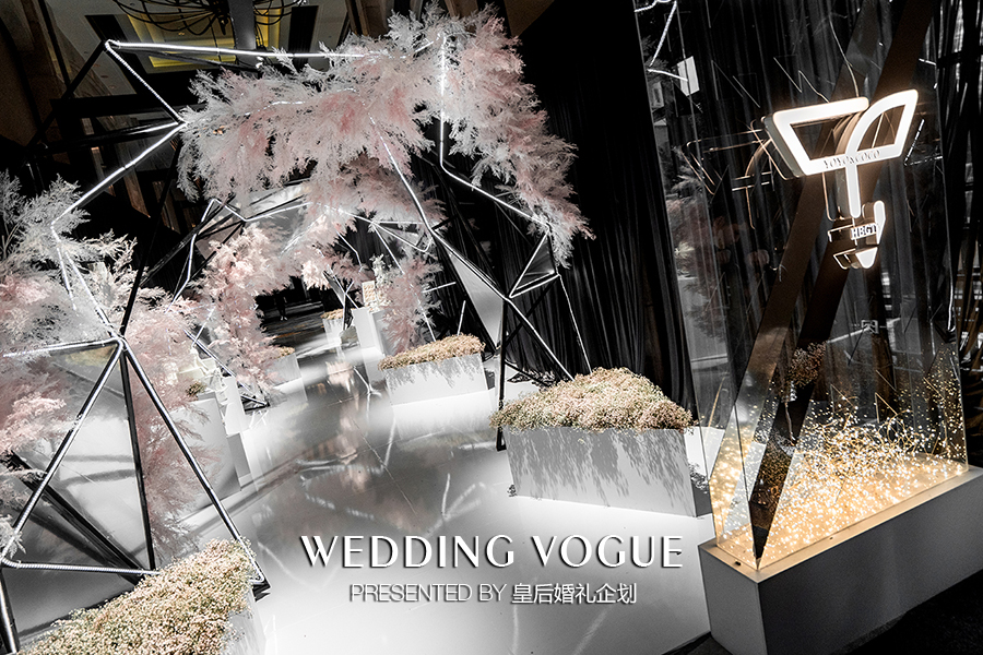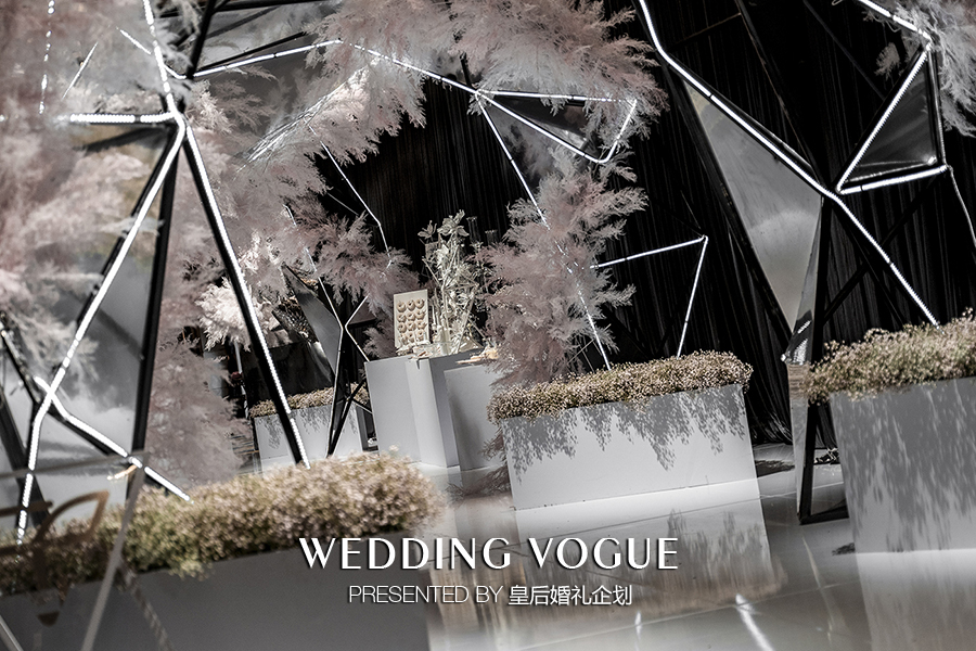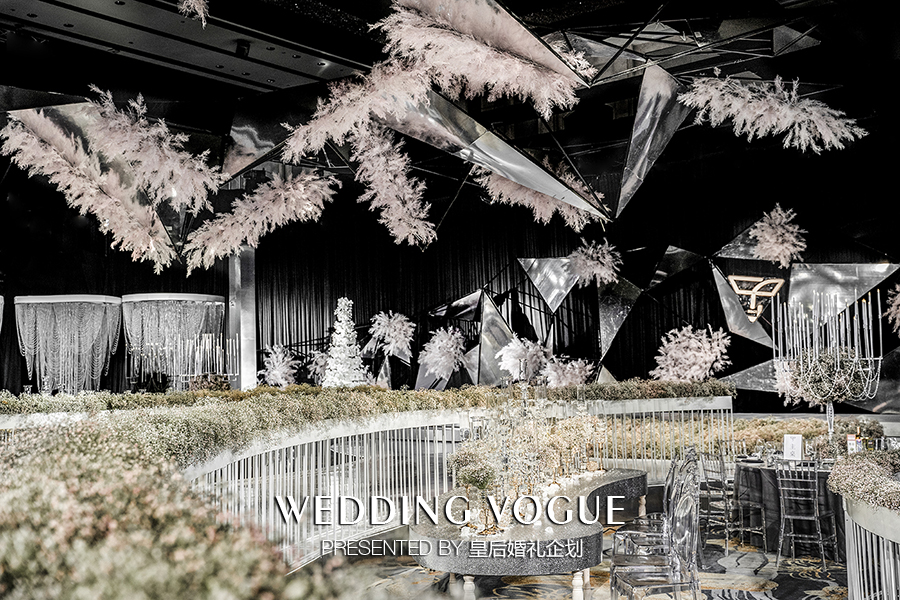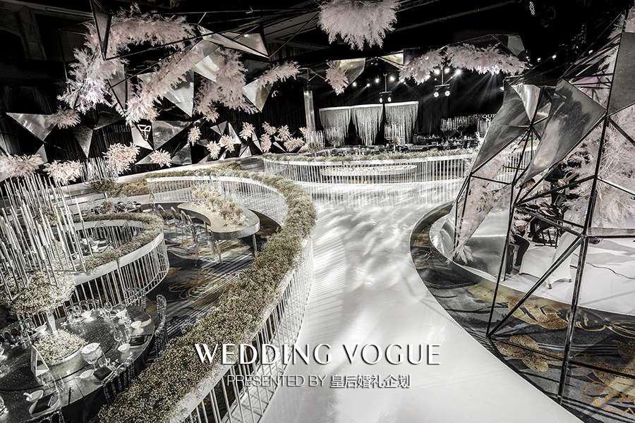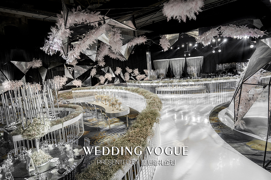 而利用形态各异的镜面组合来呈现前卫的科技感,并将婚礼从纯粹的花花草草中,和现今的快时尚材料做连接,也使整个简洁感的设计在一片纯净之中显得熠熠与浪漫,让人印象深刻