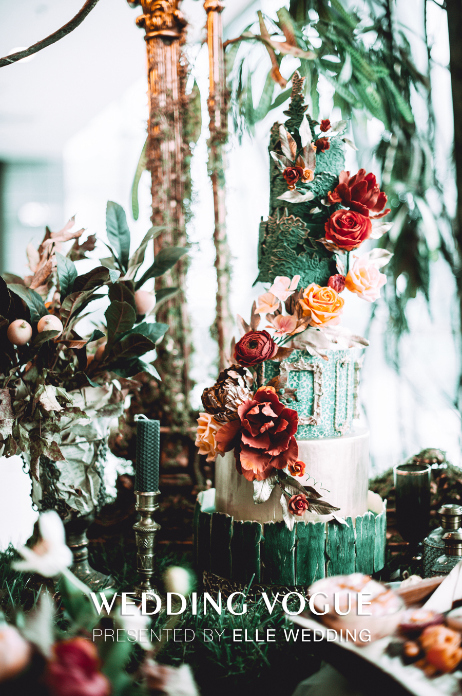 复古精致的甜品台,与纱幔、与藤条缠绕着,像极了森林中无序生长的状态,兀自地美着。