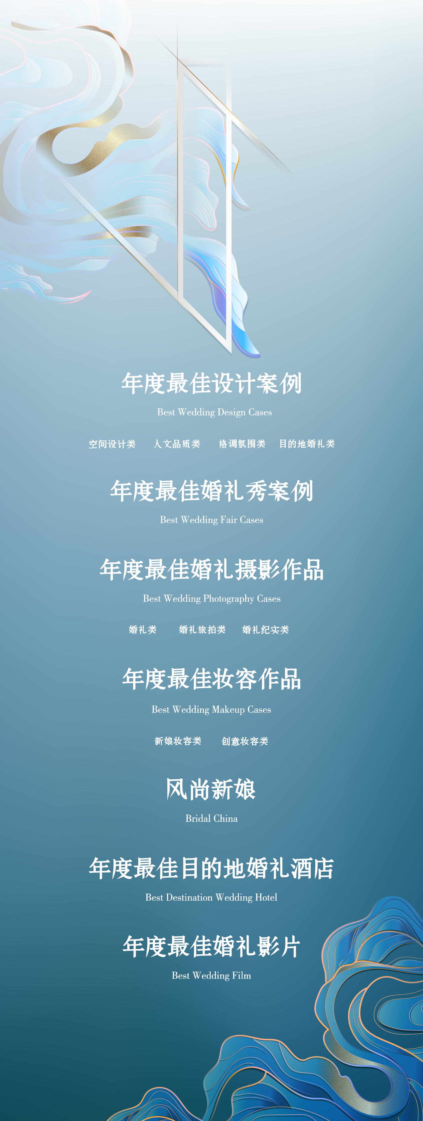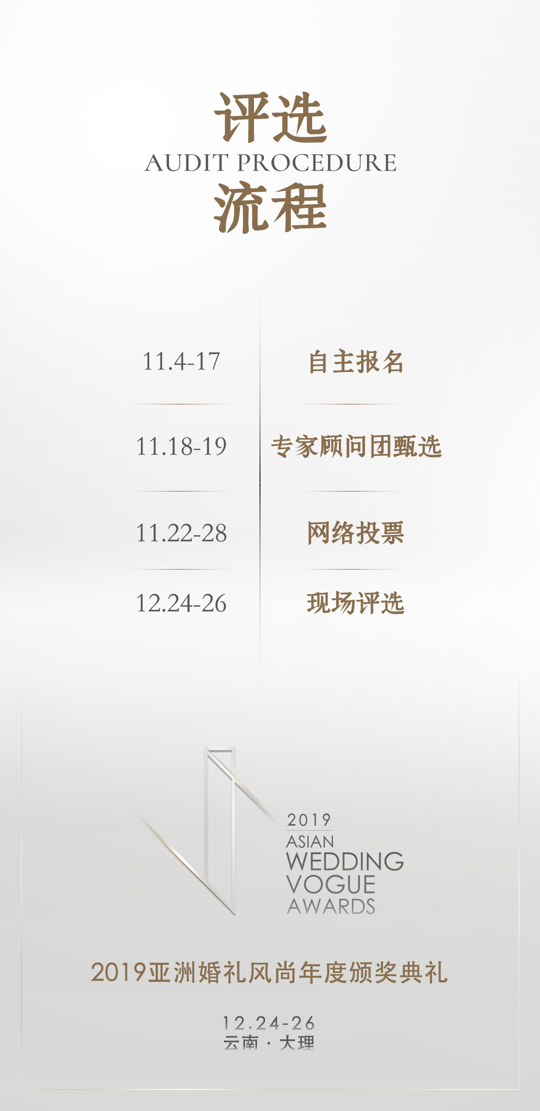 4. 根据网络投票,专家顾问团,行业媒体评分加权后得出综合排名,每类别排名前五的作品,进入2019亚洲婚礼风尚年度颁奖典礼现场评选,前三名获奖。