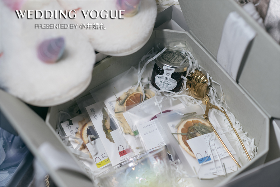 日式玻璃杯、贝壳滤茶器、树莓果酱以及绣了名字的晨袍、可爱的独角兽拖鞋礼物都是新娘精心准备的。