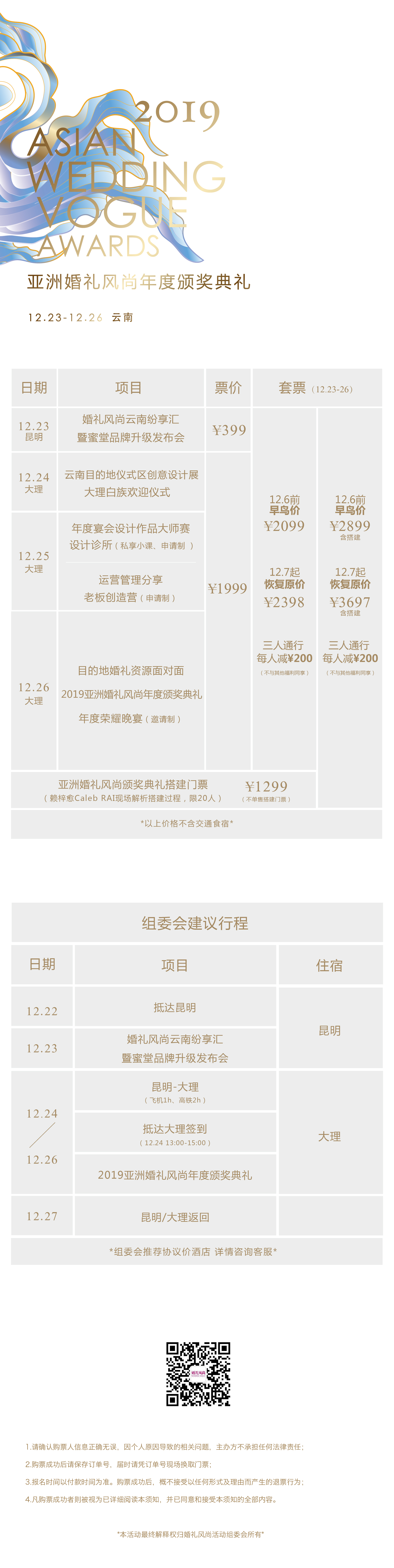 提交报名的千部作品中,通过初筛的作品将于2019亚洲婚礼风尚年度颁奖典礼微网站中展示,并于12月29日20时开启网络投票。