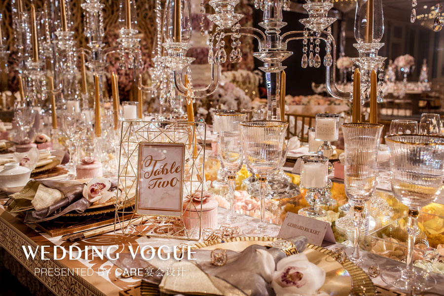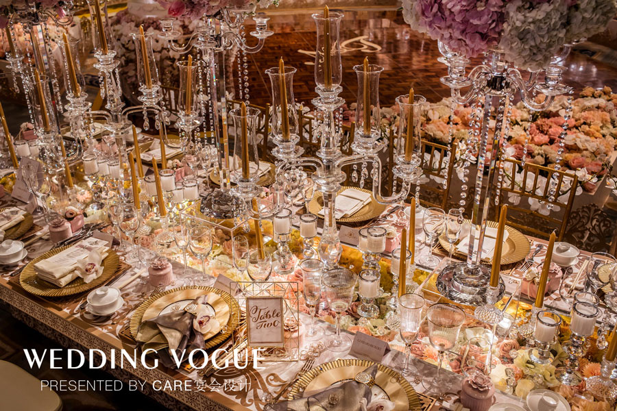 晚宴以粉色和香槟金为主色,CARE和宴会设计师成伟给Tracey制造了一场尊贵又奢华的女王梦,所有的细节、装饰、桌卡、桌花都透露着优雅、高贵、精致的气息。