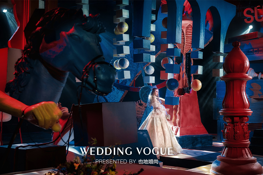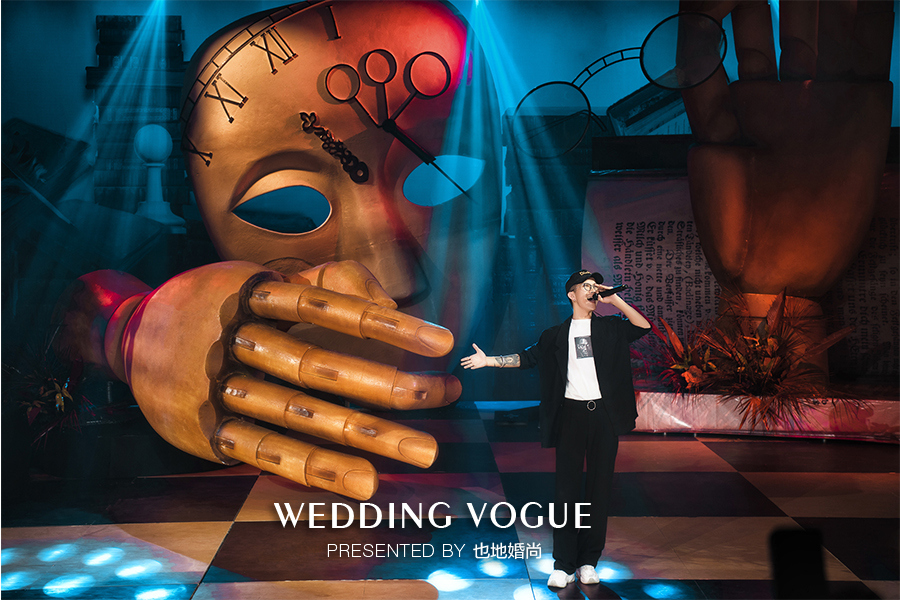 所以,我们地面用大棋盘格拼接了将近600平的面积,要求宾客着黑白两色服装入局。