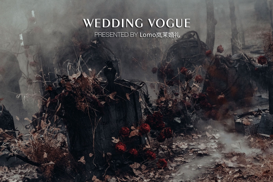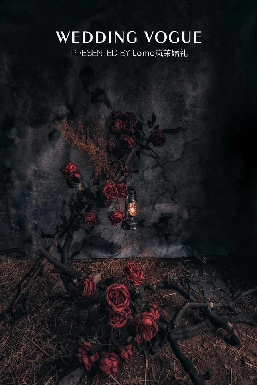 这是一个带有穿越性的设计,场景营造的是新娘百年之后的回忆。所以在颜色和材质上,都是用了一些对撞的方式,教堂已经破败,而玫瑰花还在盛放,但同时枯草也在丛生,烛台已经布满锈迹,可烛光还在闪耀。