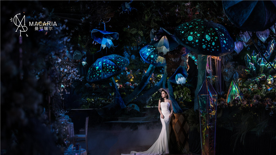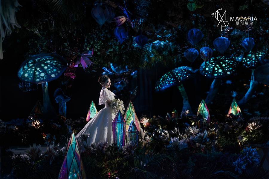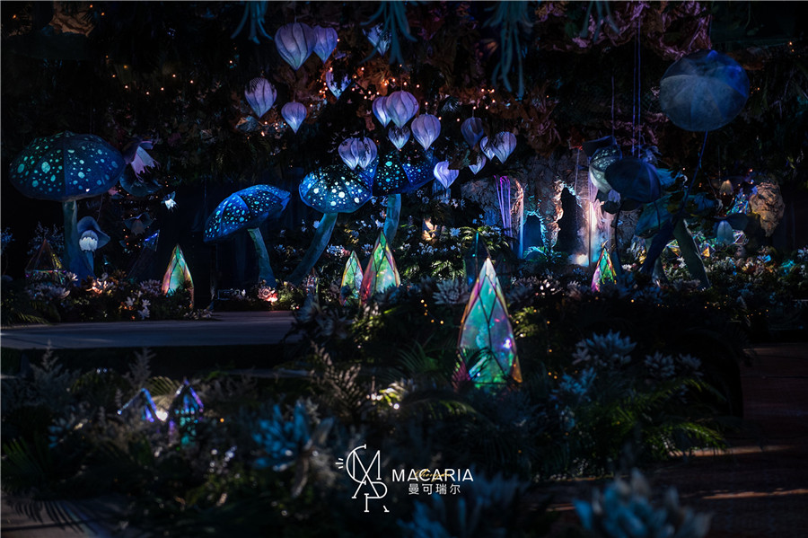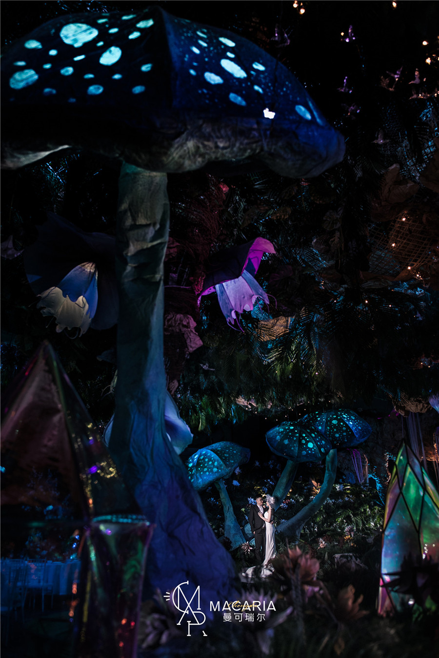 “怀表将时间封锁在丛林中,连蘑菇和木头都缠绕着芬芳,在魔幻的电影感观婚礼中,有氤氲的谜林,斑斓的蘑菇,迷幻又带点奇妙。”