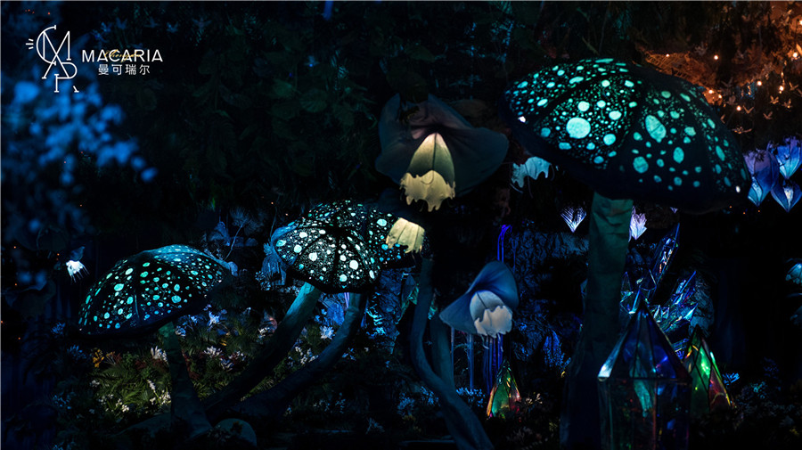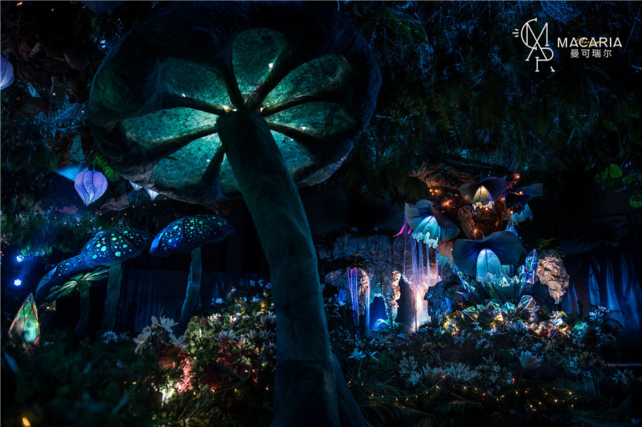 起点的10多米直径双层大圆错层叠加,圆上的夜空背景在染色灯的映衬中,更显大气磅礴,内空是通天的瀑布,周围岩石花艺装点、穹顶的瀑布洒下,让这个静态的空间仿佛被施加了魔法,所有的一切都是那么的有生命力。