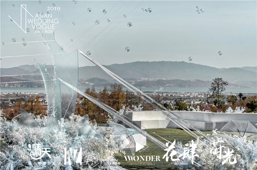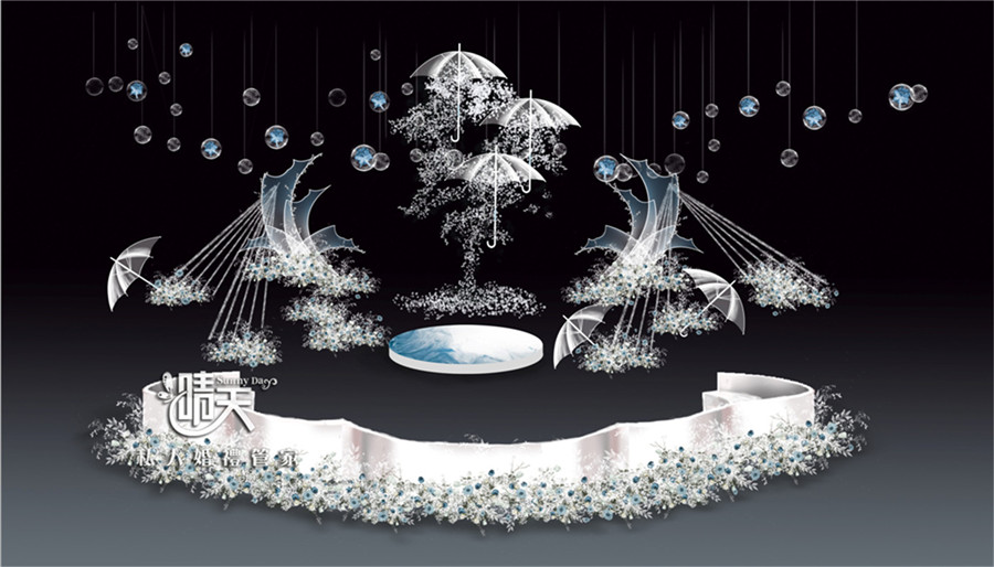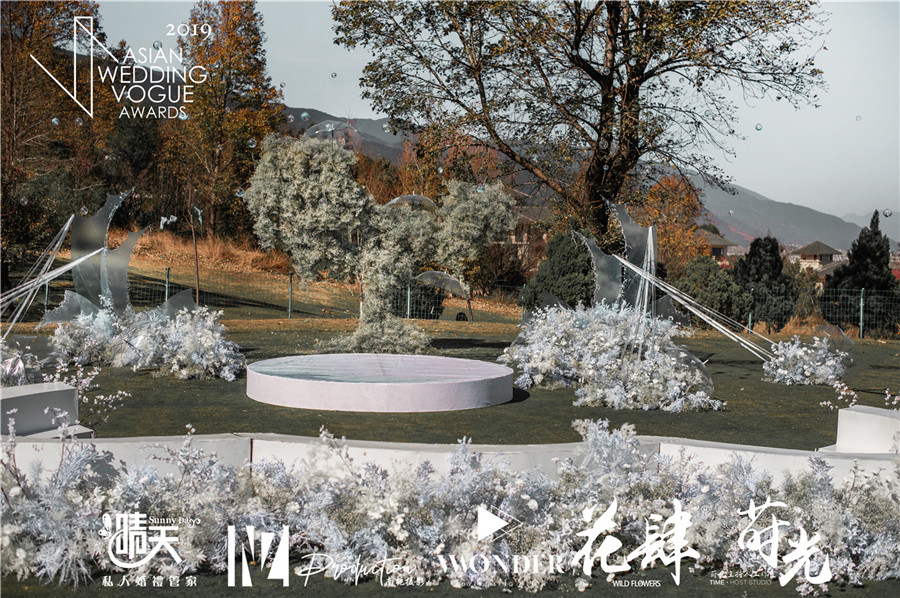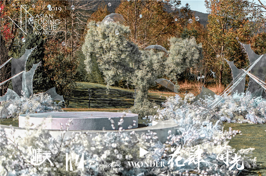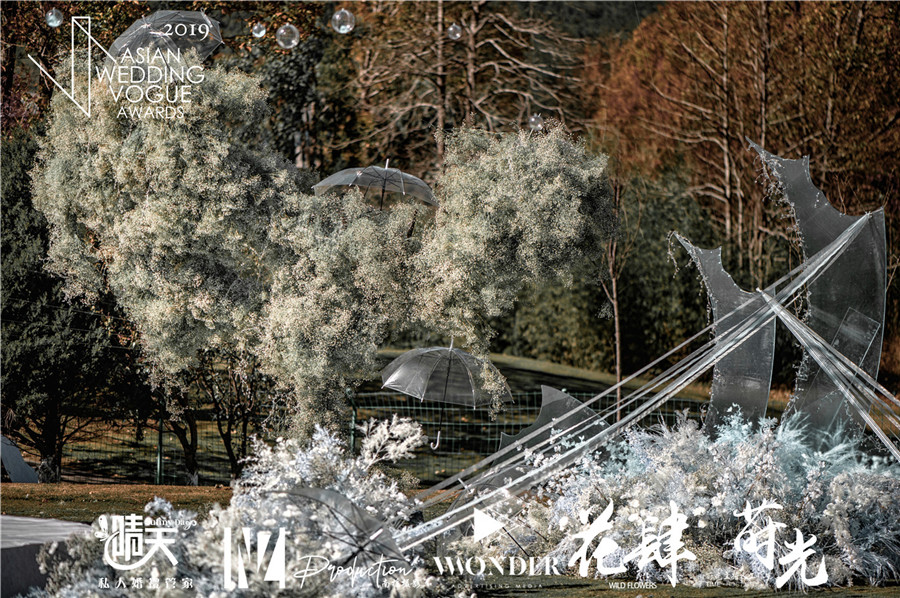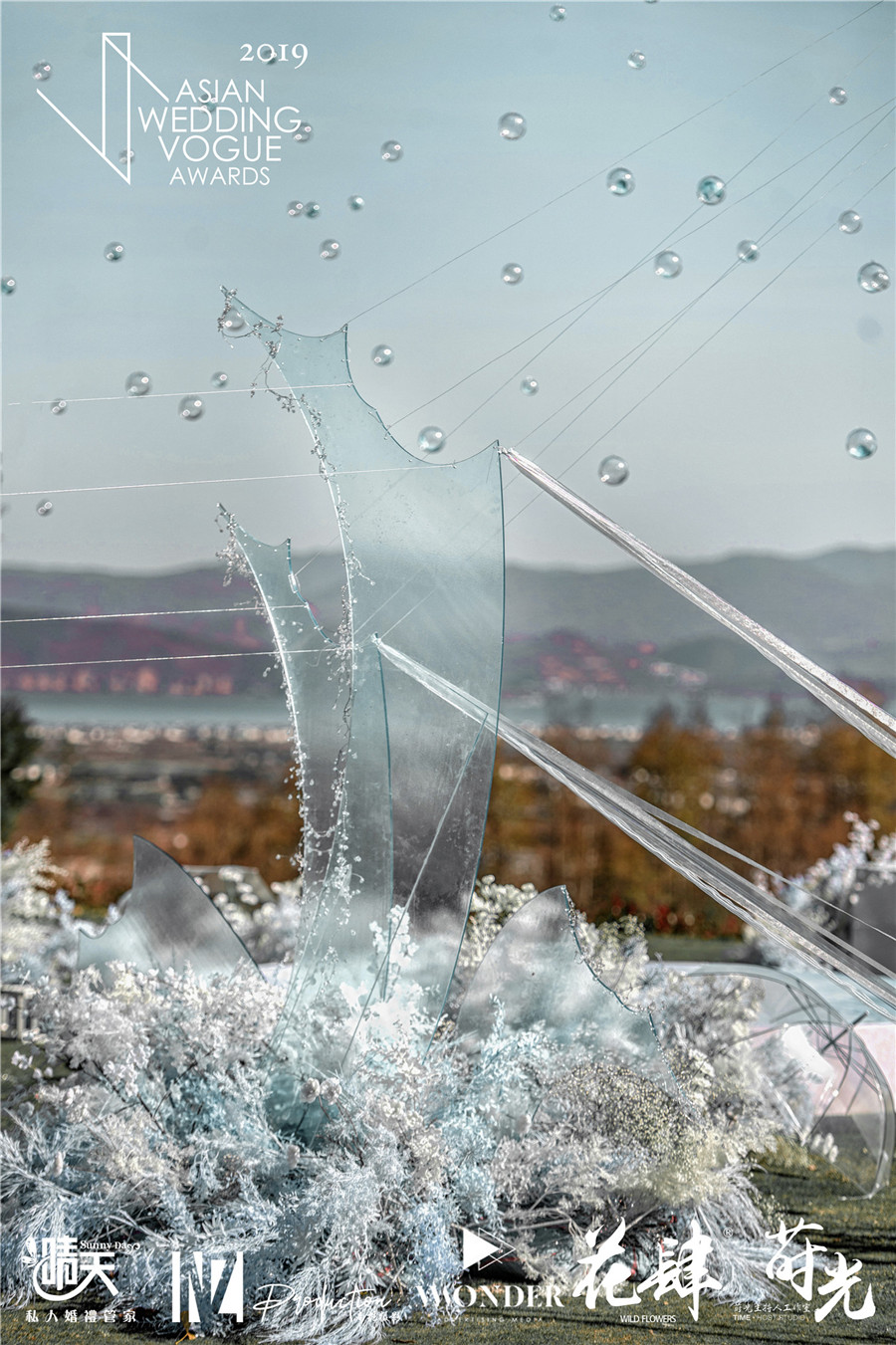 主仪式区用大量的满天星花材和透明的亚克力,来体现水花溅起的形态,同时加入了伞的元素去体现对洱海水源的保护。