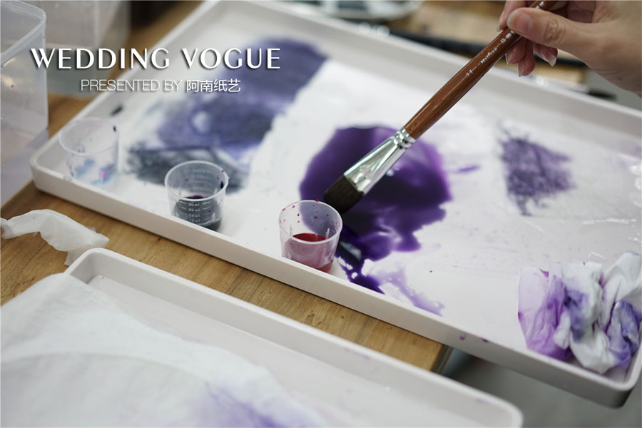 纸张的上色和染色环节,可以极大锻炼学员的色彩搭配能力,同时它也是非常有趣生动的环节。市面上可以使用的鲜花颜色有限,但通过纸张染色,以及色彩搭配就可以满足更大范围的场景设计。而在这个课程当中,不同学员对于色彩感受以及设计风格均不同,女生倾向尝试艳丽的色彩,而男生创造黑白系列同样惊艳。通过这个练习,极大激发了学员的创作欲望。