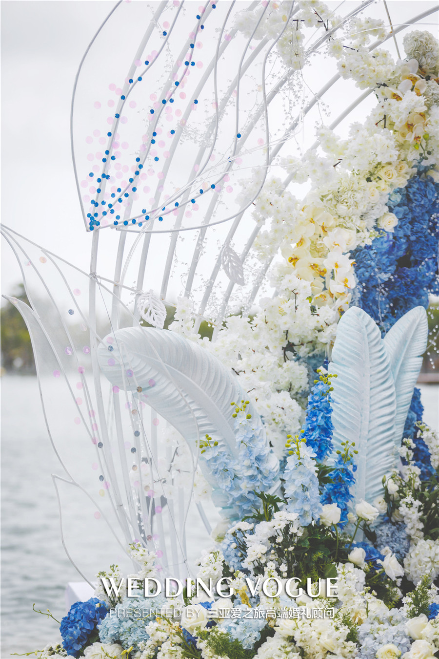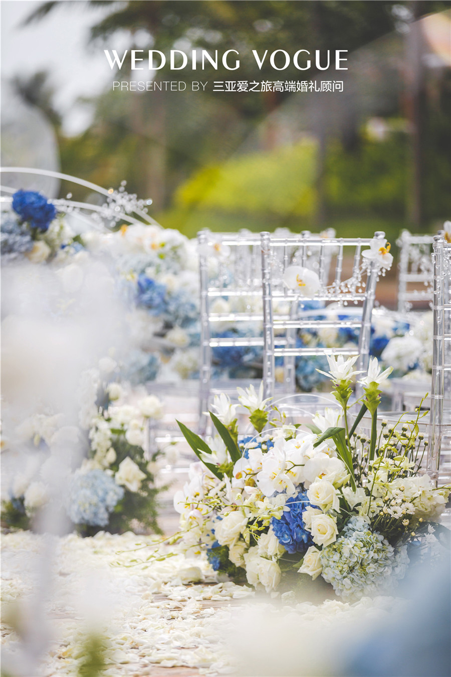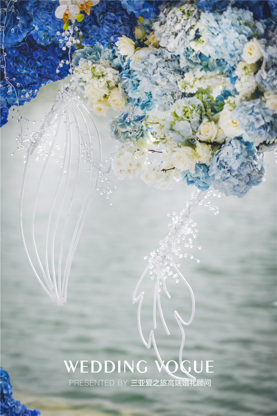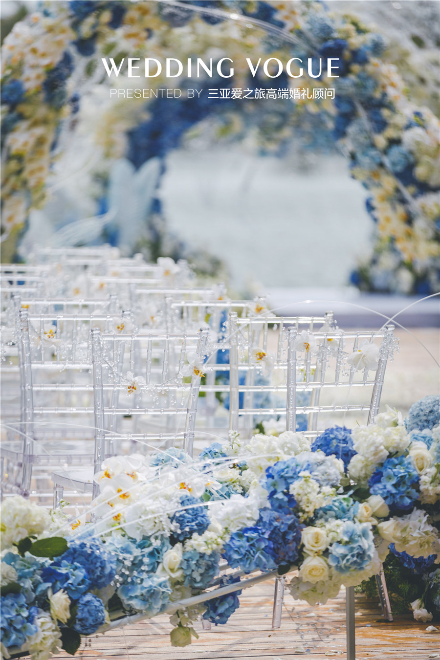 在整体的布置上,选用了清新纯粹的蓝白色为主色调。透明的水晶材质、通透的蓝色,凸显纯粹质感,装饰白色的蝴蝶兰、玫瑰、蓝色的绣球,鲜花点缀,唯美而又浪漫。